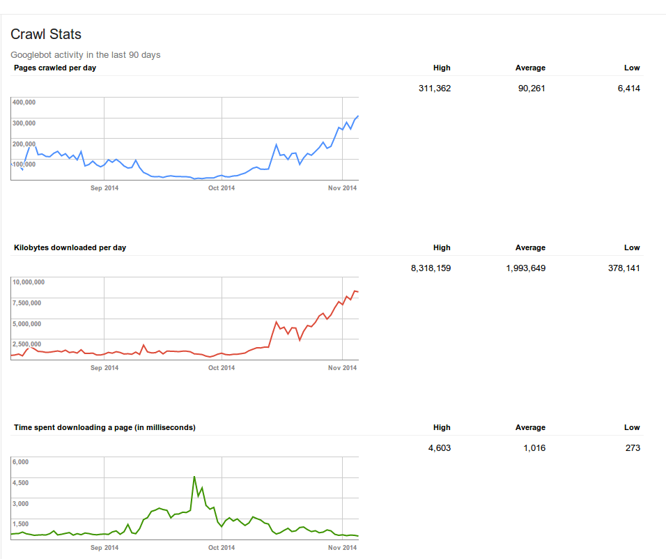[1] This image is from 2014, when Google previously announced they were crawling JavaScript websites, showing our customer's switch to an AngularJS app in September. Google basically stopped crawling their website when Google was required to execute the JavaScript. Once that customer implemented Prerender.io in October, everything went back to normal.