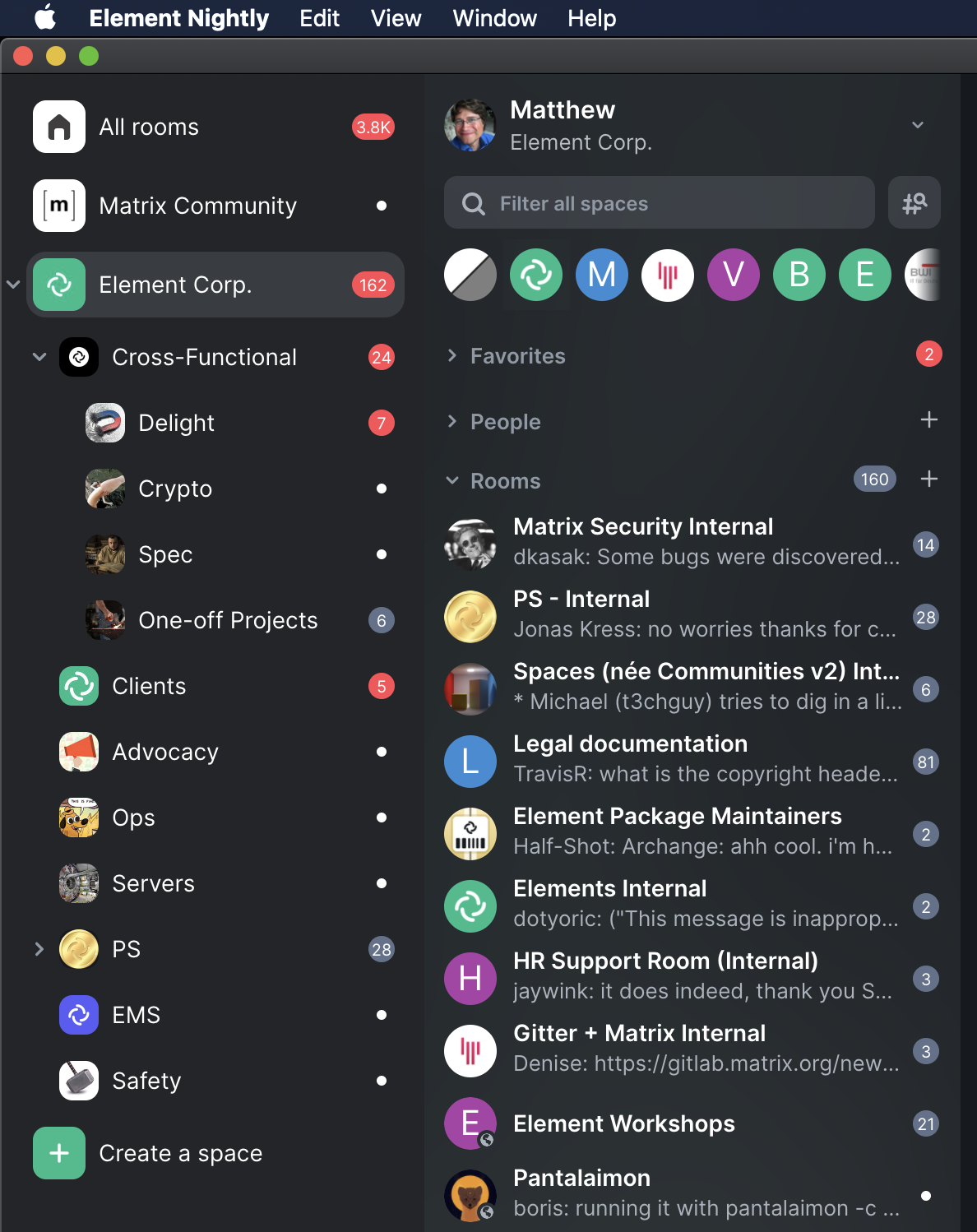 Also, Matrix's Spaces (even in Beta) seem more flexible and thought out than the second best implementation I know, in Slack.