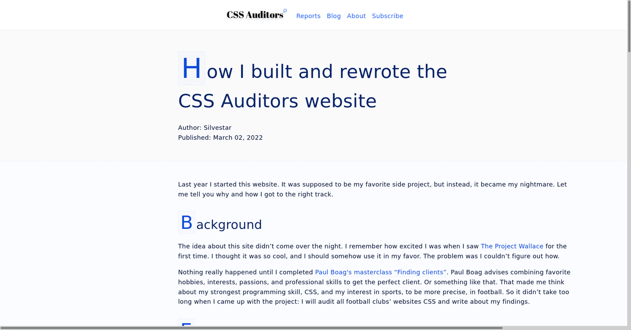 I built and rewrote the CSS Auditors website css-auditors.com 2 points by starbist 4 years ago · 1 comment Reader PiP Save scim-knox-twox 4 years ago There is a big horizontal scroll: https://i.postimg.cc/vHfnTFrC/obraz.pngNewest FF.