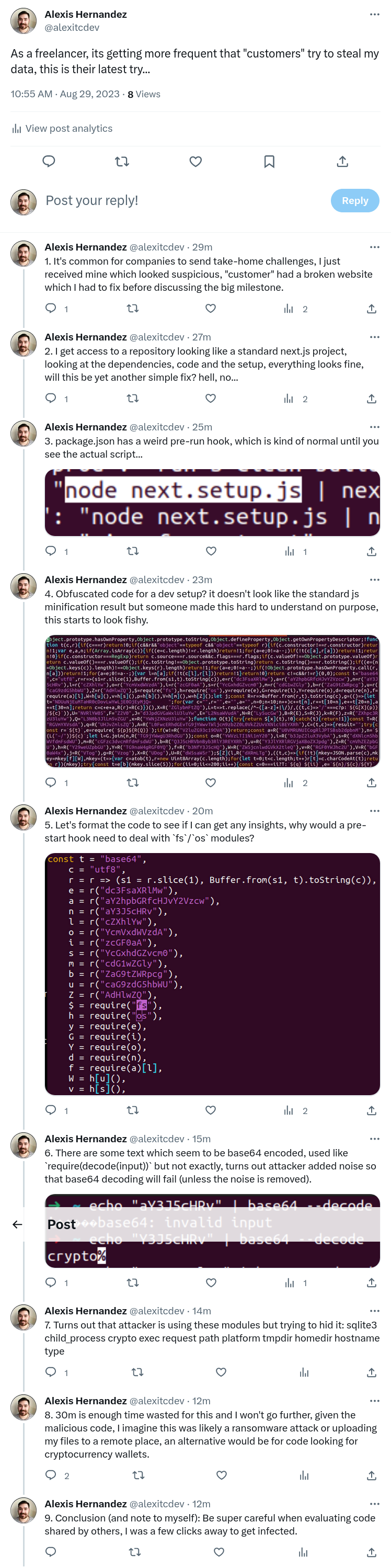 Have you saw any similar approach? I definitely remember reading about similar cases on HN some time ago: random HR tries to poach a dev from a company, but during the interview they manage to hack the current employer of the dev. Maybe I can even find it... (though don't hold your breath) Edit: If you were holding your breath, you can let it go: https://news.ycombinator.com/item?id=32001742 That's an interesting post, thanks for sharing. I forgot to link a small technical thread I created explaining my case: https://twitter.com/alexitcdev/status/1696582302267236604 EDIT: Same thread but as an image https://codepreview.io/assets/takehome-challenge-thread.png