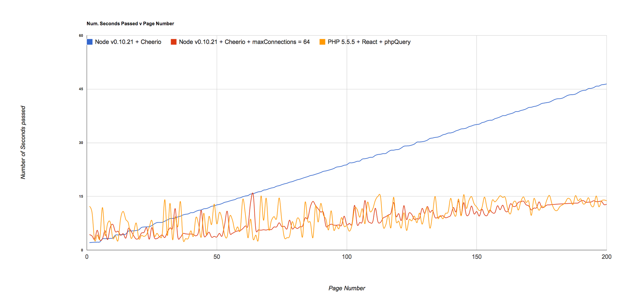 > Update: A few people have mentioned that Node by default will use maxConnections of 5, but setting it higher would make NodeJS run much quicker. As I said, im sure NodeJS could go faster - I would never make assumptions about something I don't know much about - and the numbers reflect that suggestions. Removing the blocking PHP approach (because obviously it's slow as shit) and running just the other three scripts looks like this: