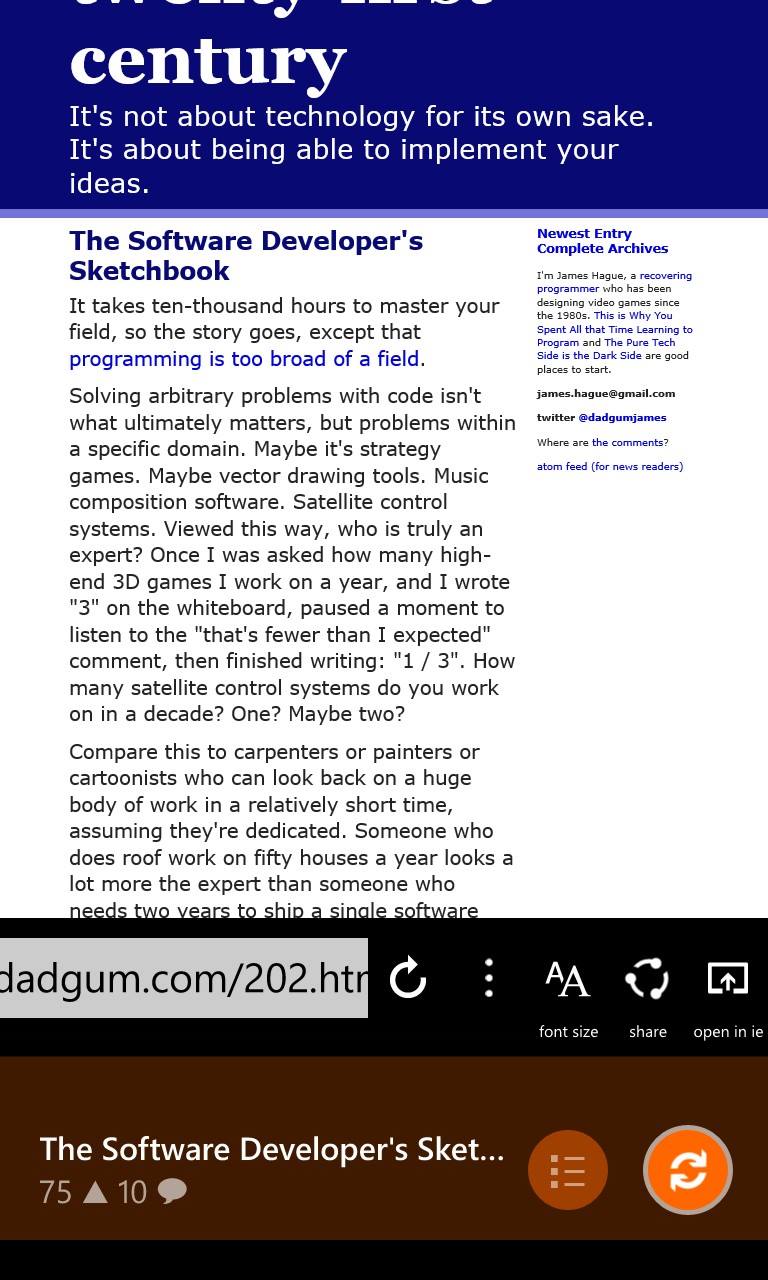 The address/toolbar below the article feels more like Android than WP. On WP you usually get an explanation of icons in the toolbar when stopping up because their captions are right underneath the low end of the screen. Took me a while to figure out what the icons meant which IMHO isn't that great UX. Also a reason why I like the toolbar design on WP, because it's compact and supports labels if the user needs them. Not sure how to incorporate the usual toolbar design into the current workings of the app, though.