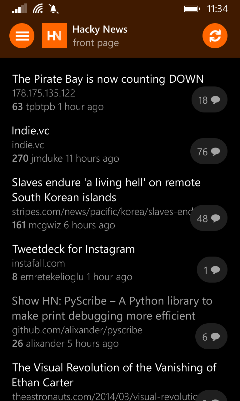 6. Another minor thing: Up until now I didn't even see that there's a screen to the left of the headline list. And now I noticed that you get there by pressing the ⇄ button. I'm not sure, as I've never designed a UI like that, but it seems to me the more-or-less default idiom for invoking such a thing is a hamburger menu button on the top left of the app (http://hypftier.de/temp/wp_ss_20150103_0003.png) or using the app's icon in the top left for the same purpose. But that's more an Androidism, I think. The canonical way on WP would probably be a Pivot control, but that'd kill the swiping for going back to the browser. Not sure right now. Interaction feels slick and is nice with Hacky News, it's just not really native to WP in some places. The lack of the Pivot control also means that you have to swipe back to the start screen from the browser on the app/address bar, even if there is no browser history to go back to.