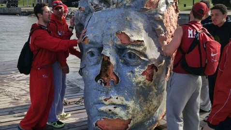 The crew team at New York's Marist College came across a puzzling sight this week when a large, foam head, floating in the Hudson River, crossed their path toward the end of their morning row.