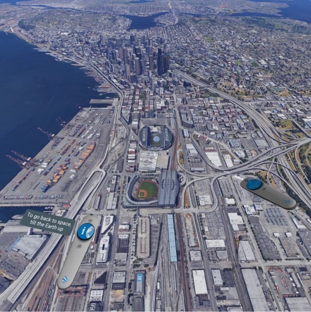 Take, for example, my casual flyover near Seattle’s Centurylink Field. I launched the app while floating high above the planet Earth and was instructed to use the Vive wands to move around. One button zoomed me closer, while another let me “grab” the planet and reorient it. I used these motions to spin the globe towards North America, then the USA, then Washington, until I was close enough to trigger a perspective shift. Before, I was looking down from a bird’s eye view; now, I was more level, like a guy in a jetpack flying over a city and checking it out.