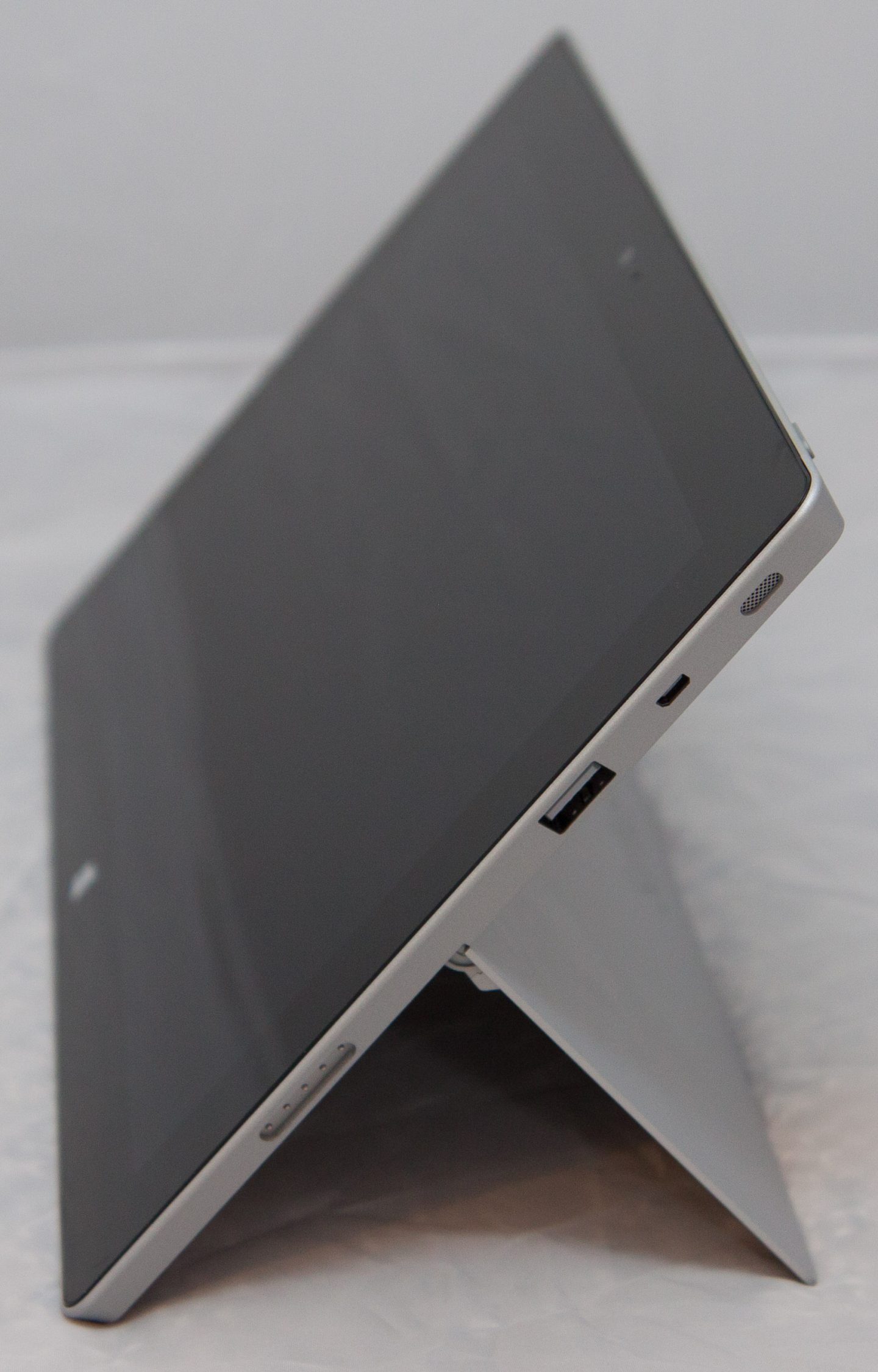 That one exception is, however, the logical place to start, just because it’s so blatant. The Surface 2 isn’t “dark titanium” (which is to say, black) anymore. It’s silver-gray. It still uses the same “VaporMg” casing, and it still feels the same, but it now looks metallic. In use, the difference is minimally noticeable. The all-glass front of the machine still has a black trim surround around the LCD, so it’s only the very edges of the system, where the case meets the glass, that betray the change.