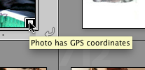 After you enable that, Lightroom tags the location data in your existing and newly-imported images and the Library grid view shows a little tag at the bottom right of the images that contain this GPS data: