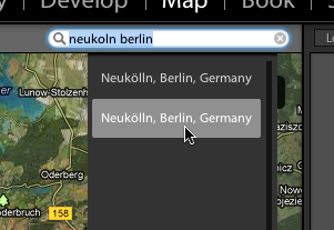 To test the two-byte language support, I entered ?? (Ainokura) into the search field. I expected the same results as from Aperture, since they both use Google’s mapping service but Lightroom didn’t find anything: