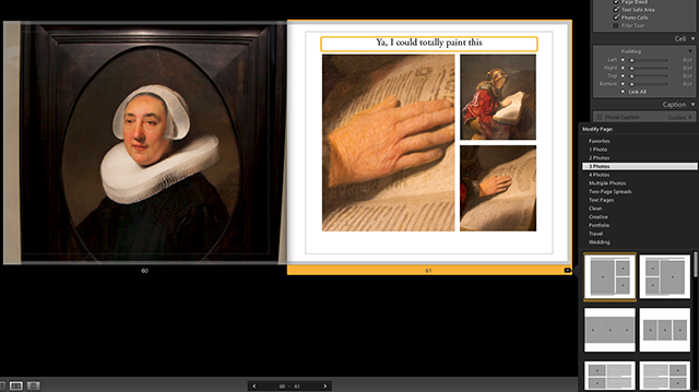 And the type presets are intuitive and clearly labelled with “caption,” “title,” etc. Playing with the book designer is dangerous because it makes even the most banal shots look great next to each other and the gutter gradient overlay gives the impression that you’re browsing a book you already own: