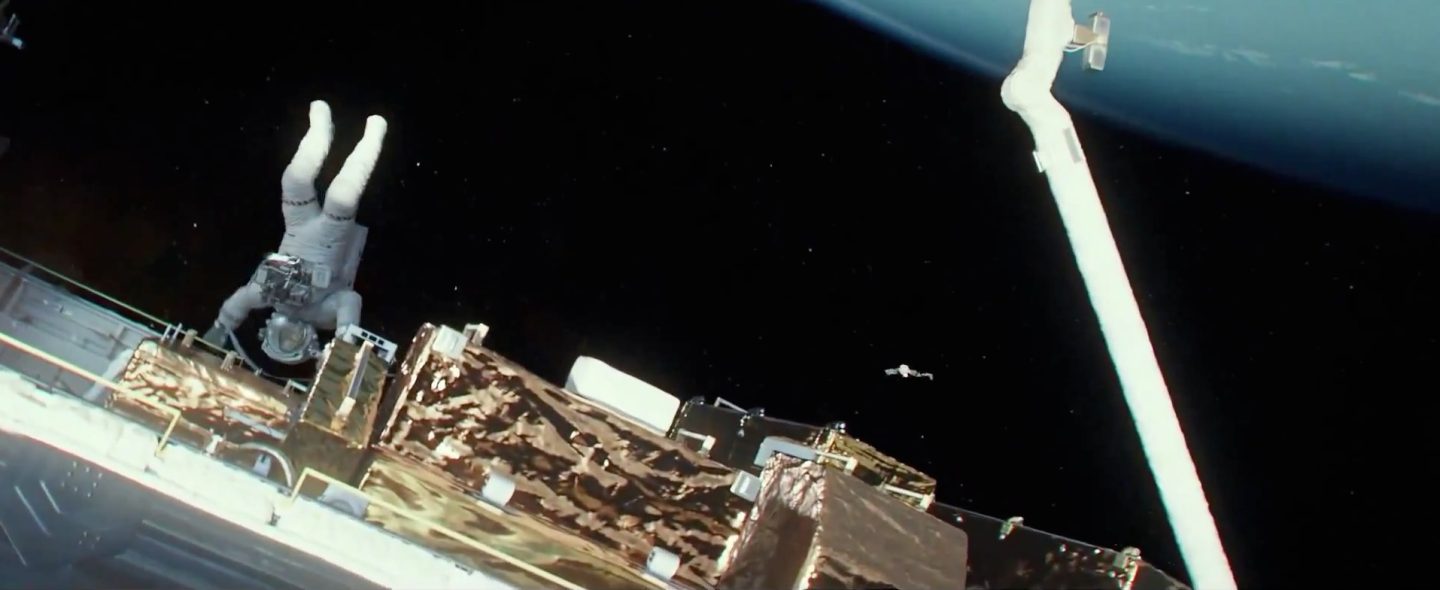 Screencap from the Gravity trailer, showing the start of a giant debris storm. Note the monstrous size of the piece of debris near frame center. Credit: Warner Bros