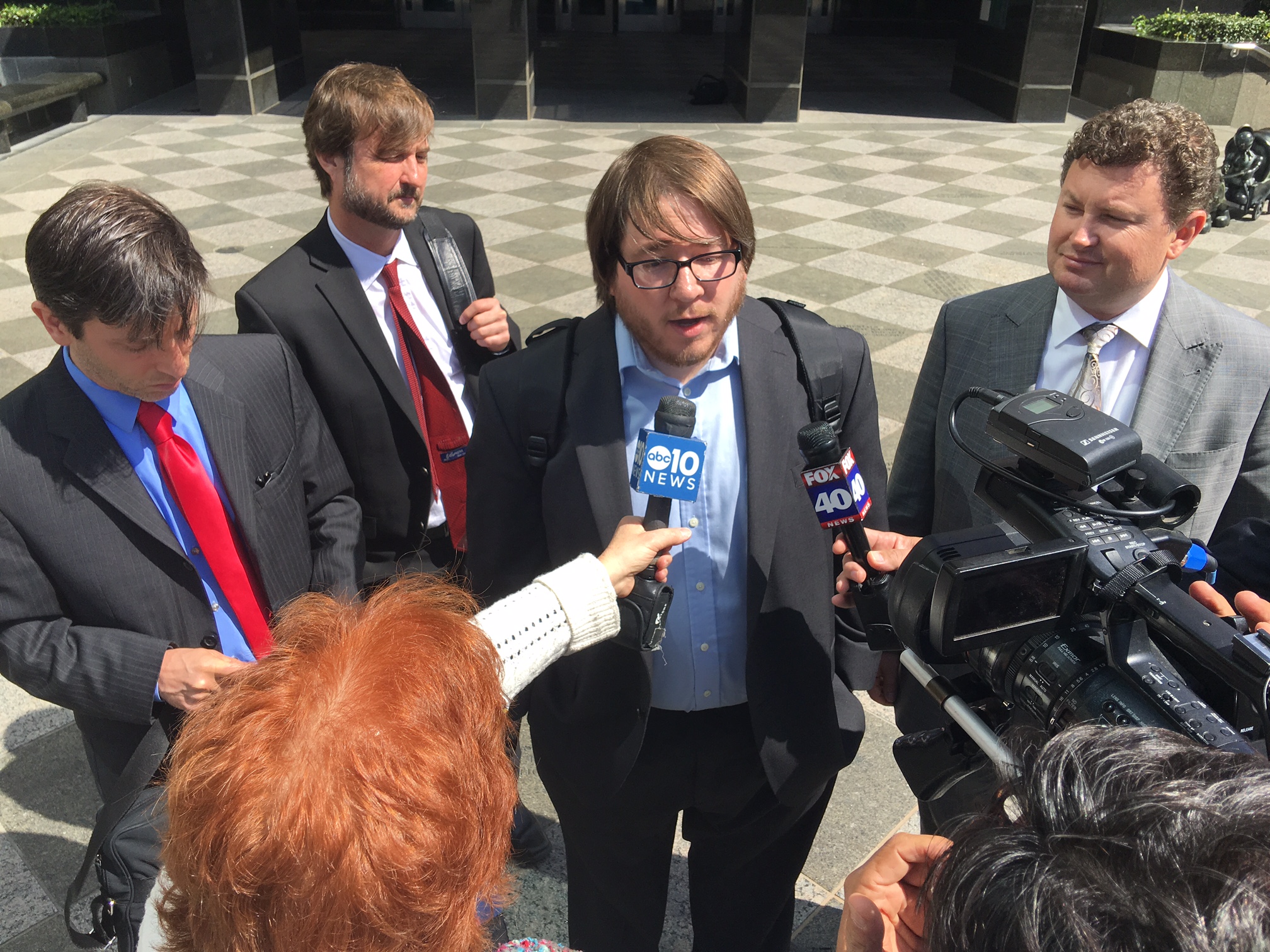 Matthew Keys talks to reporters after he was sentenced in April 2016 to two years in prison, surrounded by his lawyers, including Mark Jaffe (far left). Credit: Cyrus Farivar