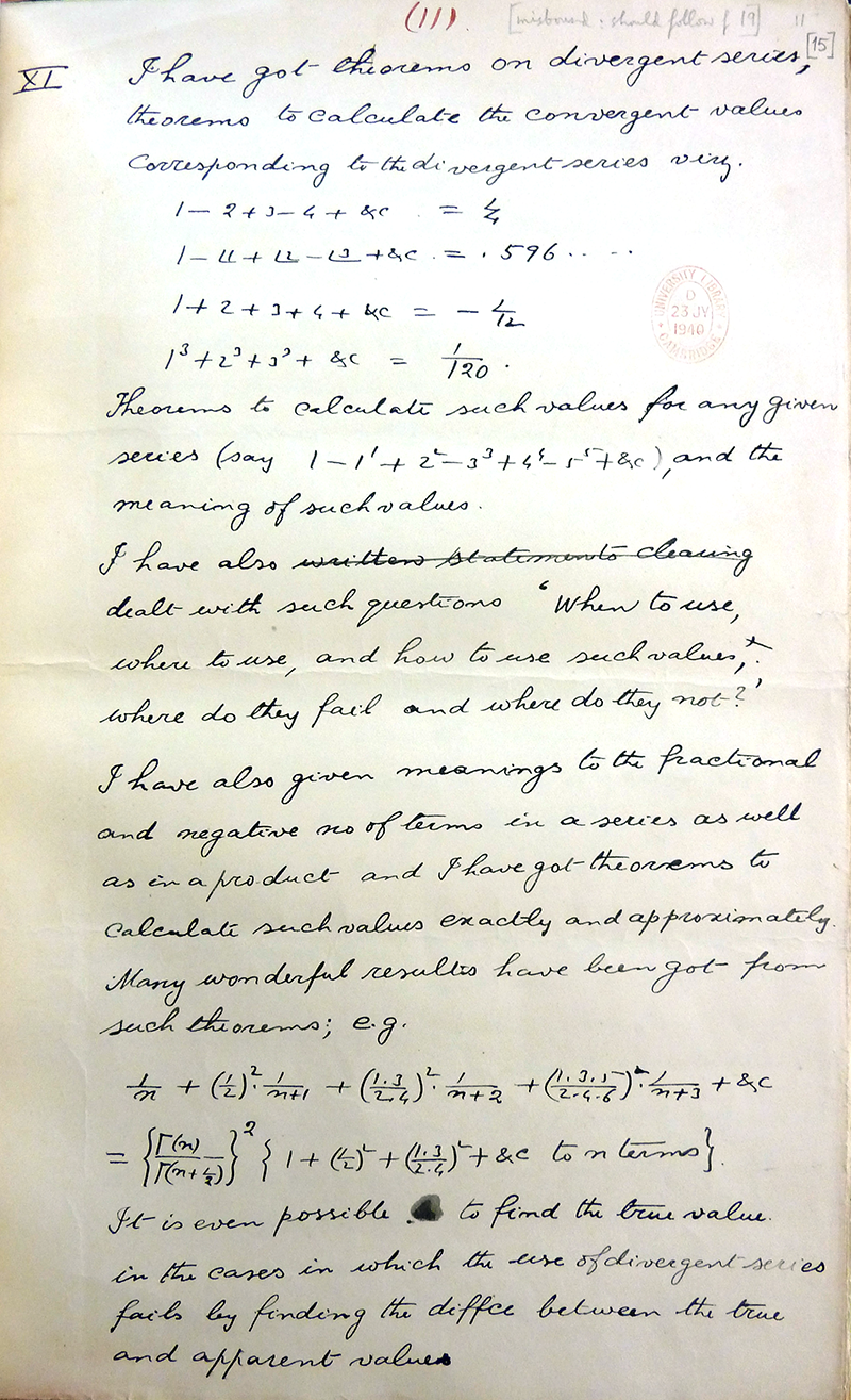 At least two pages of the original letter have gone missing. But the last page we have again seems to end inauspiciously—with Ramanujan describing achievements of his theory of divergent series, including the seemingly absurd result about adding up all the positive integers, 1+2+3+4+…, and getting –1/12.