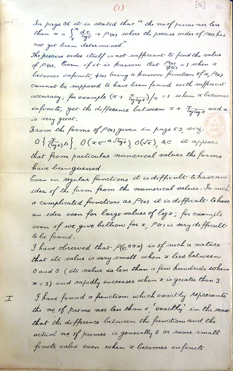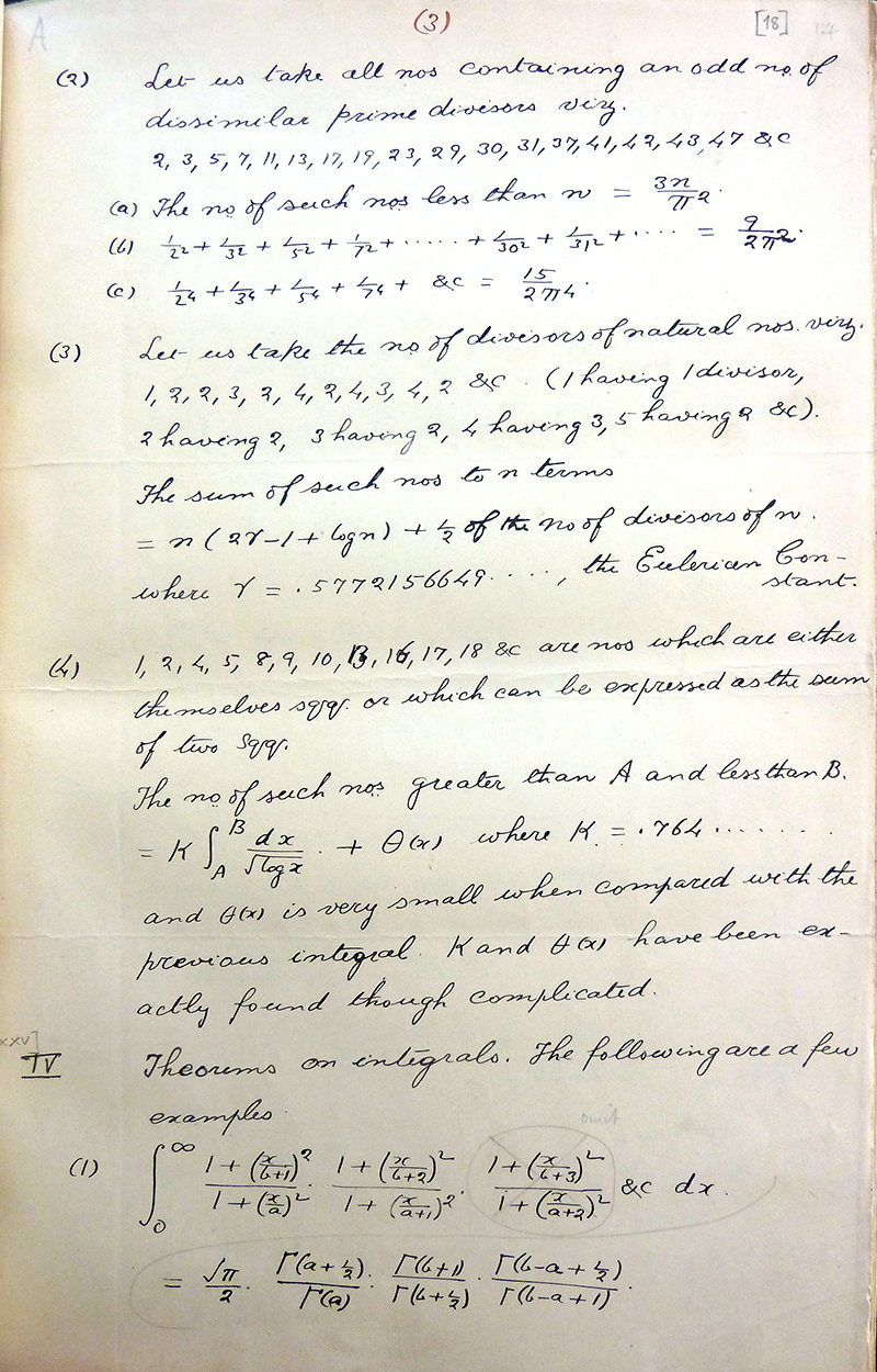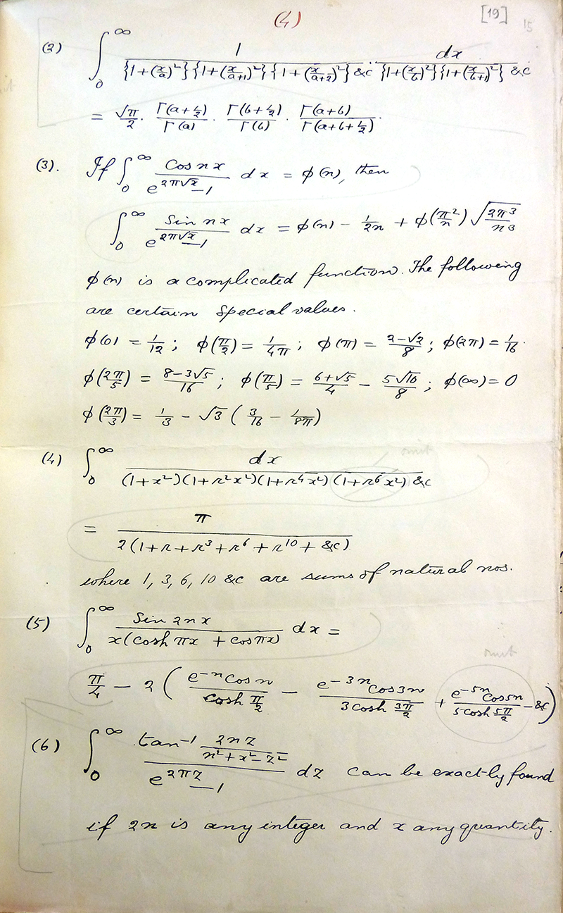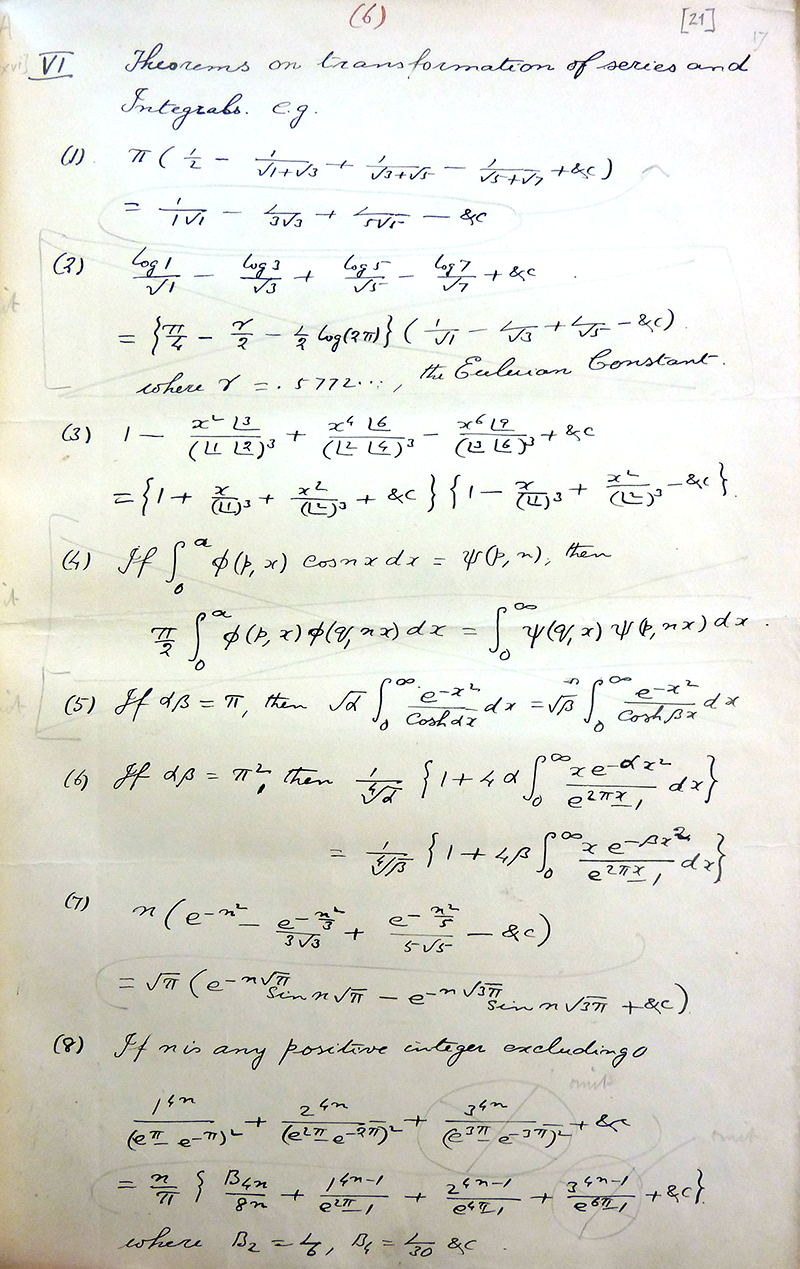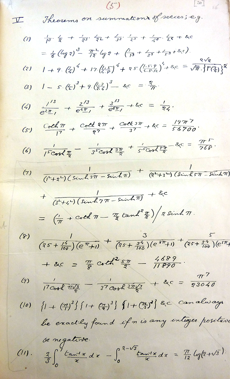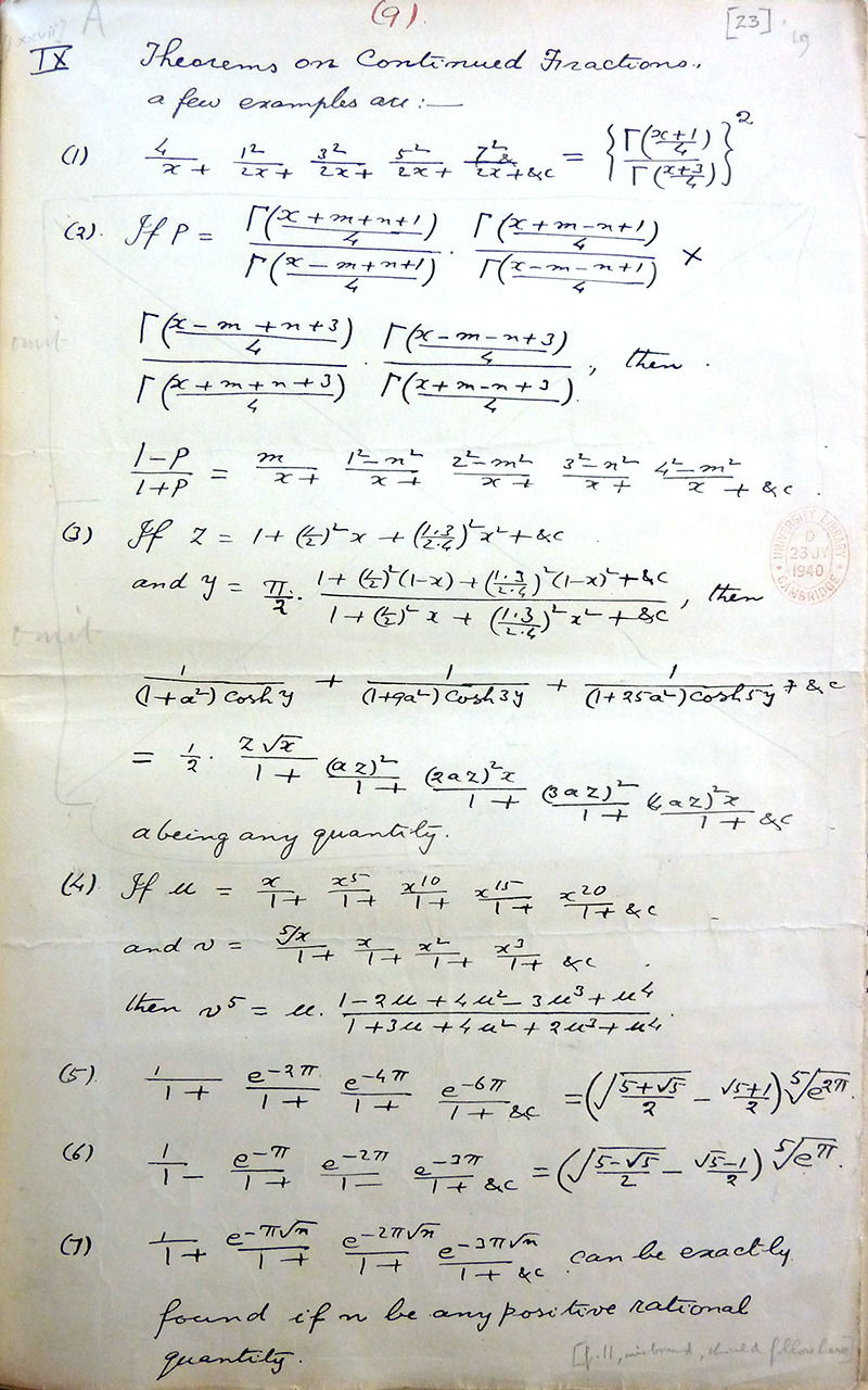 In 1940, Hardy gave all the letters he had from Ramanujan to the Cambridge University Library, but the original cover letter for what Ramanujan sent in 1913 was not among them—so now the only record we have of that is the transcription Hardy later published. Ramanujan’s three main notebooks sat for many years on top of a cabinet in the librarian’s office at the University of Madras, where they suffered damage from insects, but were never lost. His other mathematical documents passed through several hands, and some of them wound up in the incredibly messy office of a Cambridge mathematician—but when he died in 1965 they were noticed and sent to a library, where they languished until they were “rediscovered” with great excitement as Ramanujan’s lost notebook in 1976.