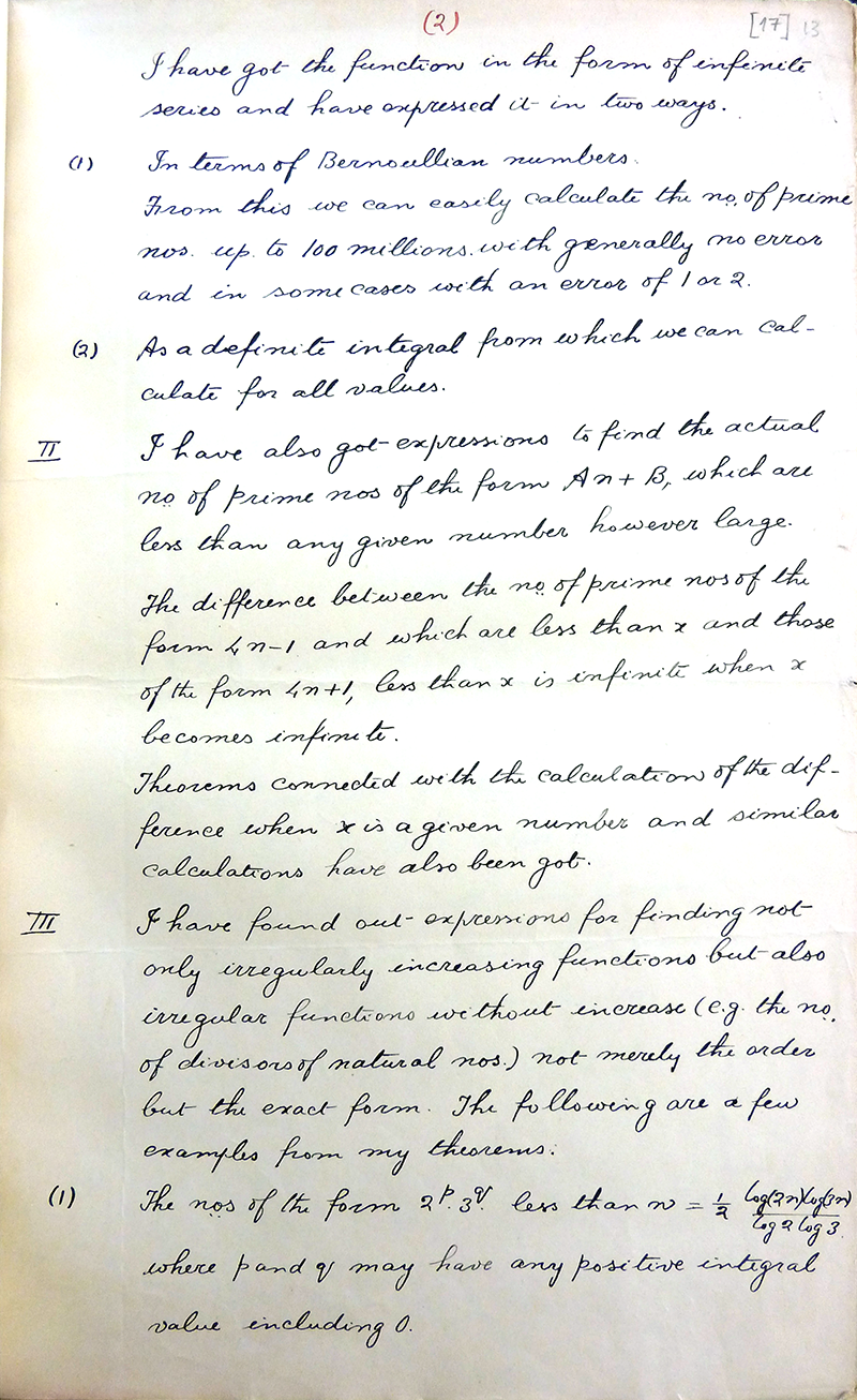 On about January 31, 1913 a mathematician named G. H. Hardy in Cambridge, England received a package of papers with a cover letter that began: “Dear Sir, I beg to introduce myself to you as a clerk in the Accounts Department of the Port Trust Office at Madras on a salary of only £20 per annum. I am now about 23 years of age….” and went on to say that its author had made “startling” progress on a theory of divergent series in mathematics, and had all but solved the longstanding problem of the distribution of prime numbers. The cover letter ended: “Being poor, if you are convinced that there is anything of value I would like to have my theorems published…. Being inexperienced I would very highly value any advice you give me. Requesting to be excused for the trouble I give you. I remain, Dear Sir, Yours truly, S. Ramanujan”.