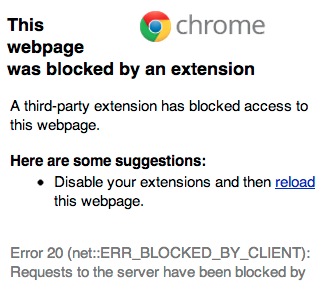 The guilty extension, I am sure, is Adblock Plus for Chrome. What that extension blocks is an ad, not a page. I can tell it’s an ad by looking on other browsers without that extension.