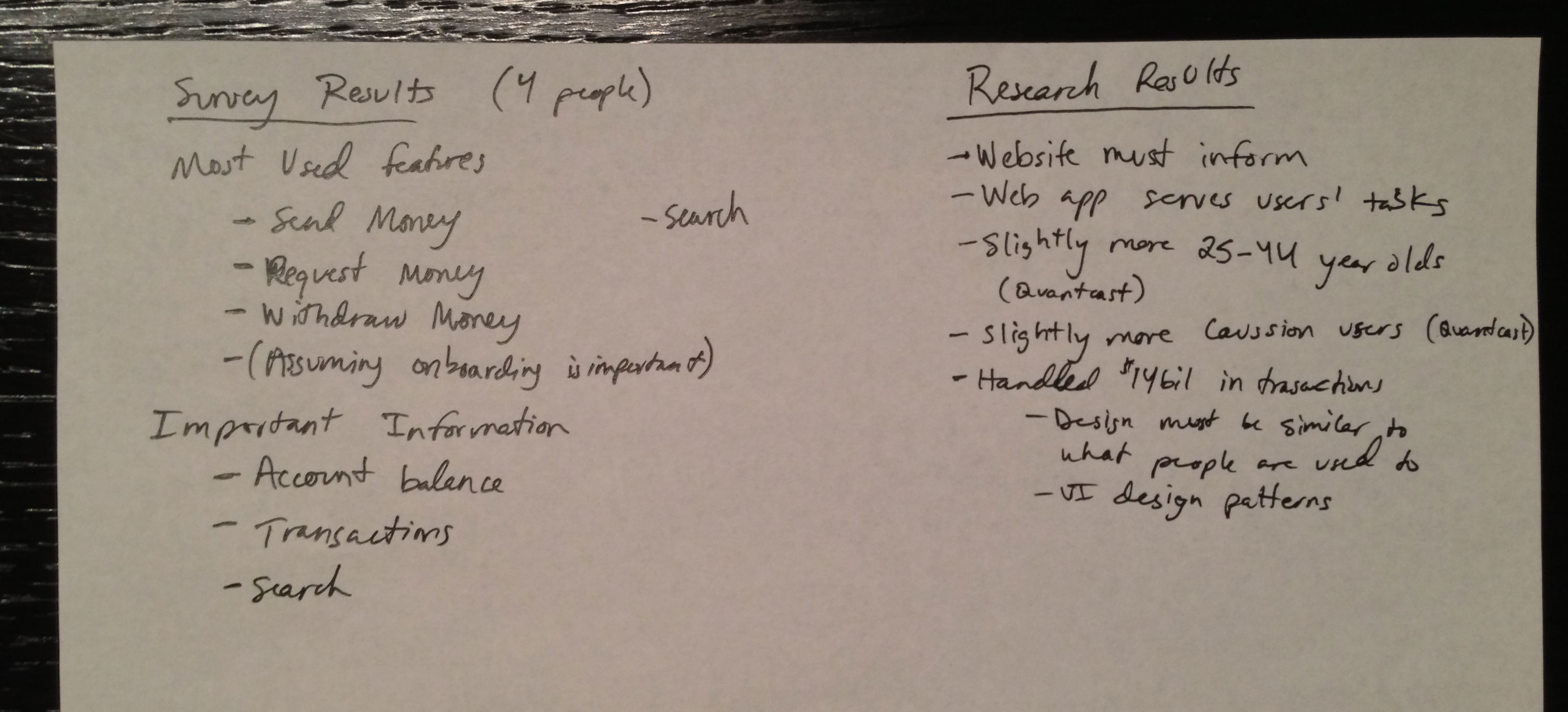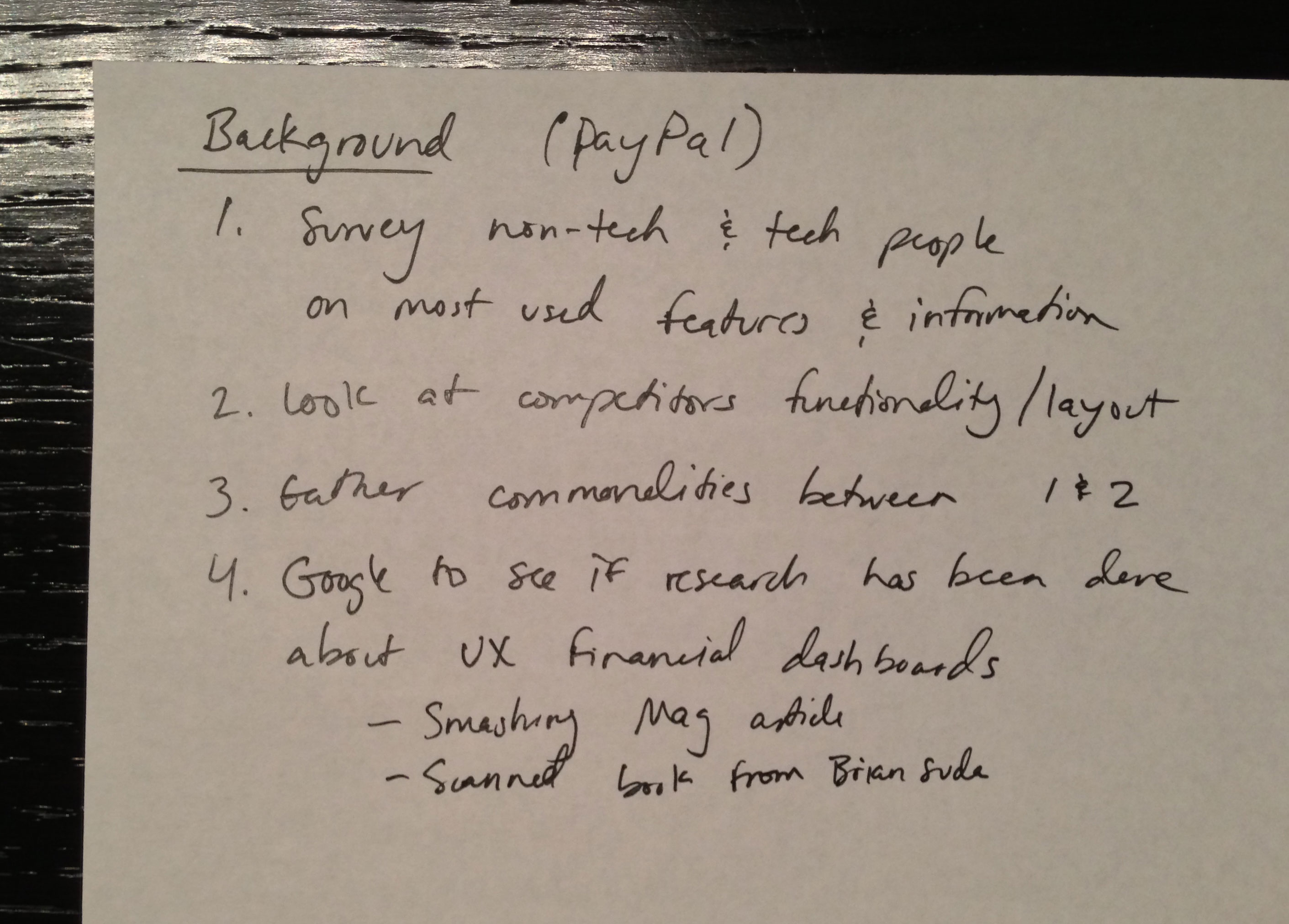 I first created a plan to attack this project. While writing down a few steps, I also knew that I wanted to interview a few non-tech PayPal users on their most used features.