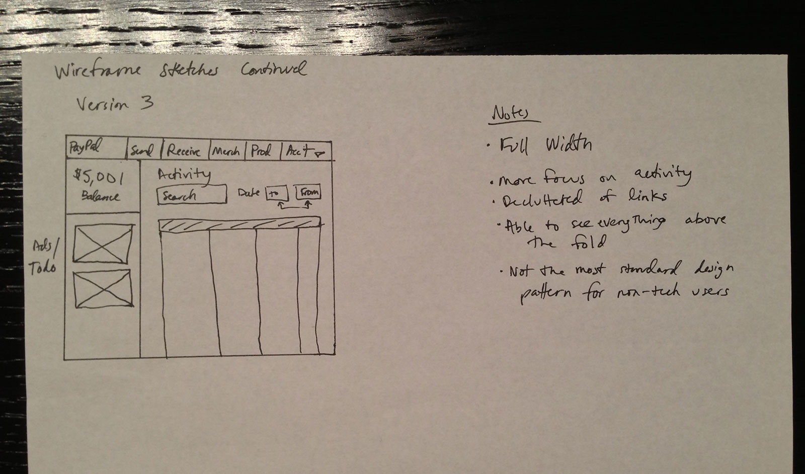 I printed out my PayPal dashboard to able to start removing features of PayPal. I wanted any buttons that were not frequently used (according to my interviewees) to be hidden in a dropdown menu or other submenus. This step helped organize my thoughts for a few wireframes and made me think about responsive characteristics, retina images, UI patterns, icons and more. You can almost think of this step as a “mobile first” strategy to hide any features that wouldn’t be on a mobile view of PayPal.