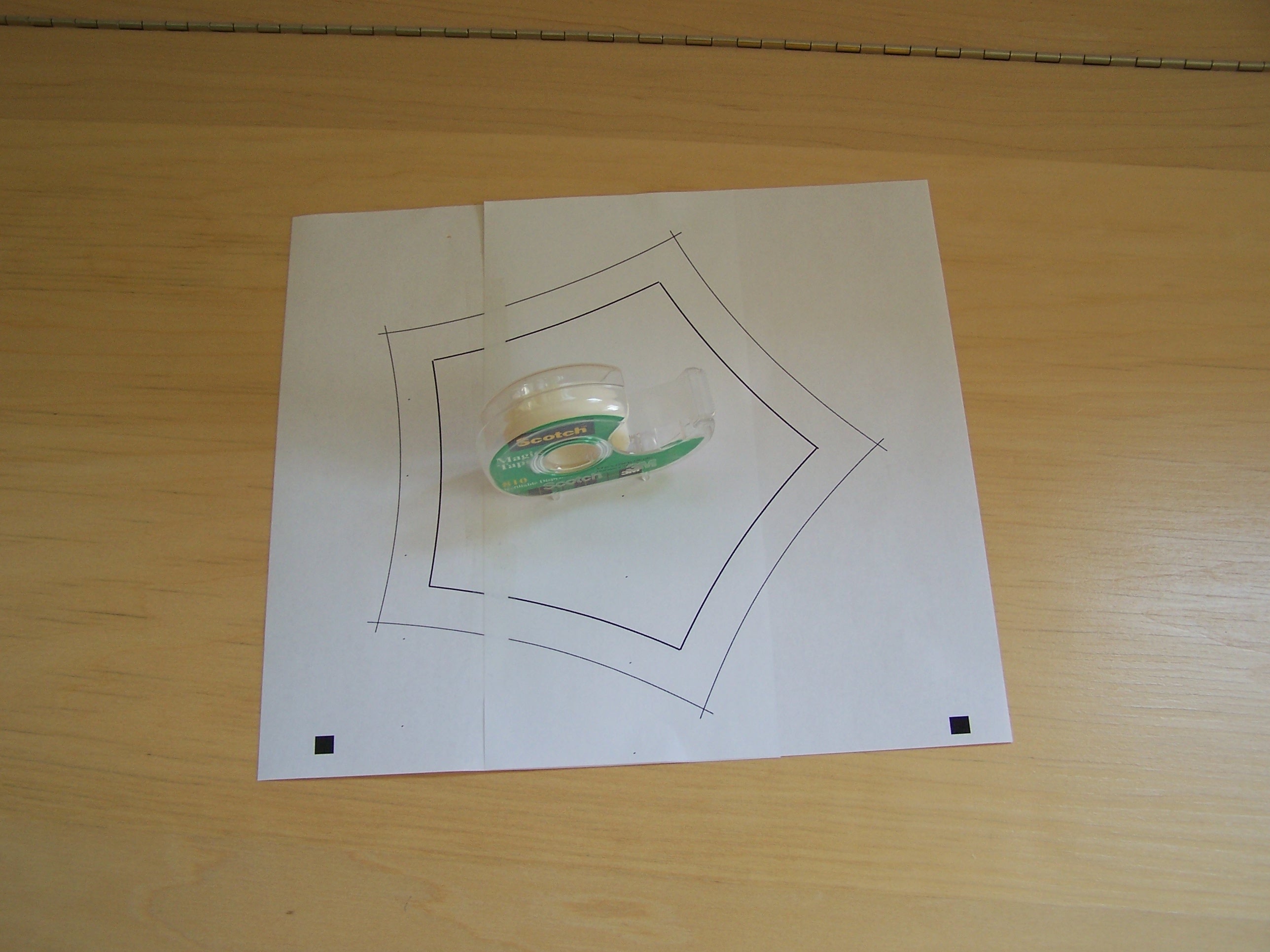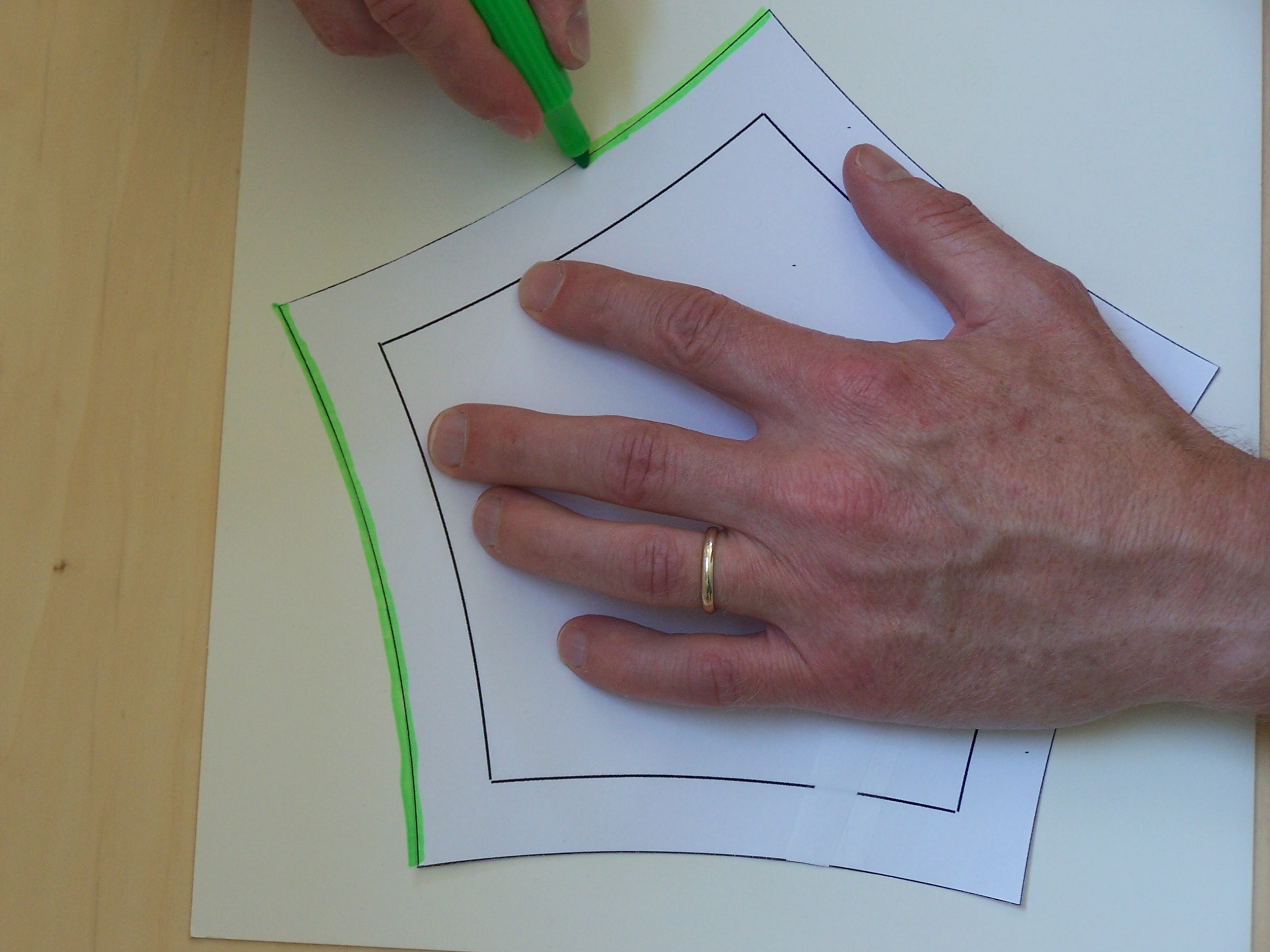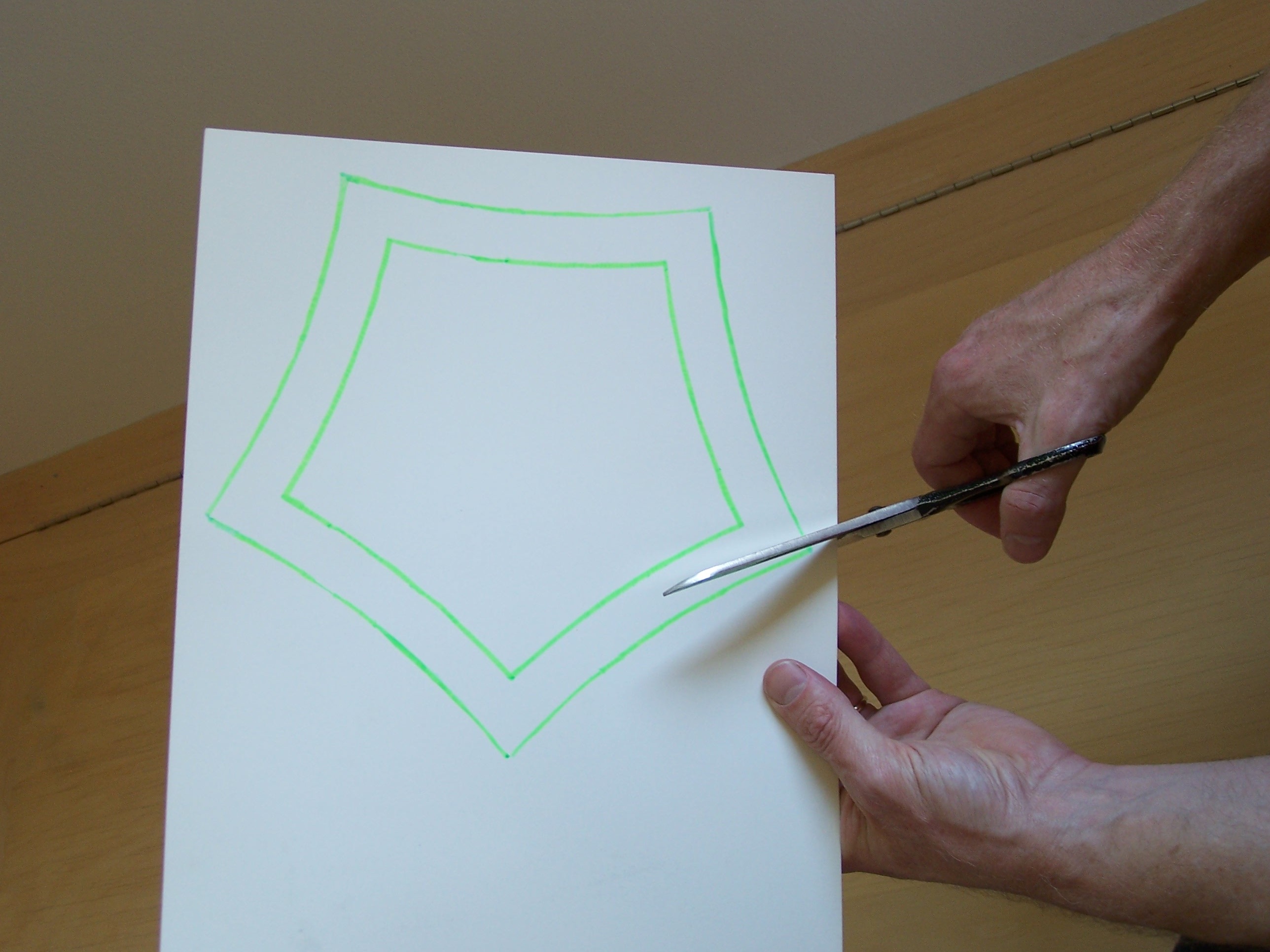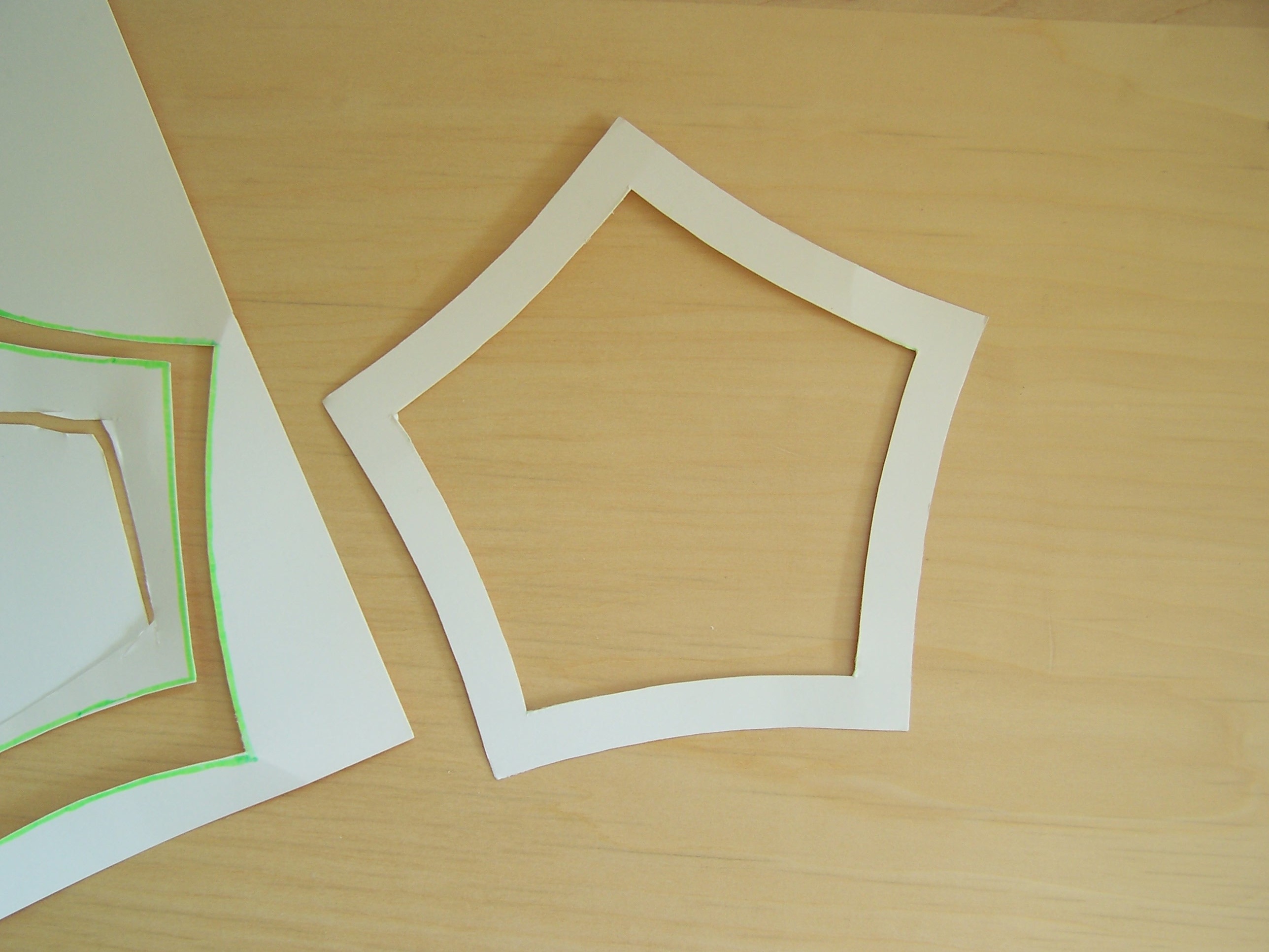 Now cut along the inner pentagon, discard the interior, and tape the remaining pentagonal strip onto the cardboard. The pentagonal strip may be a little wobbly, so make sure it aligns with the curves you traced earlier.