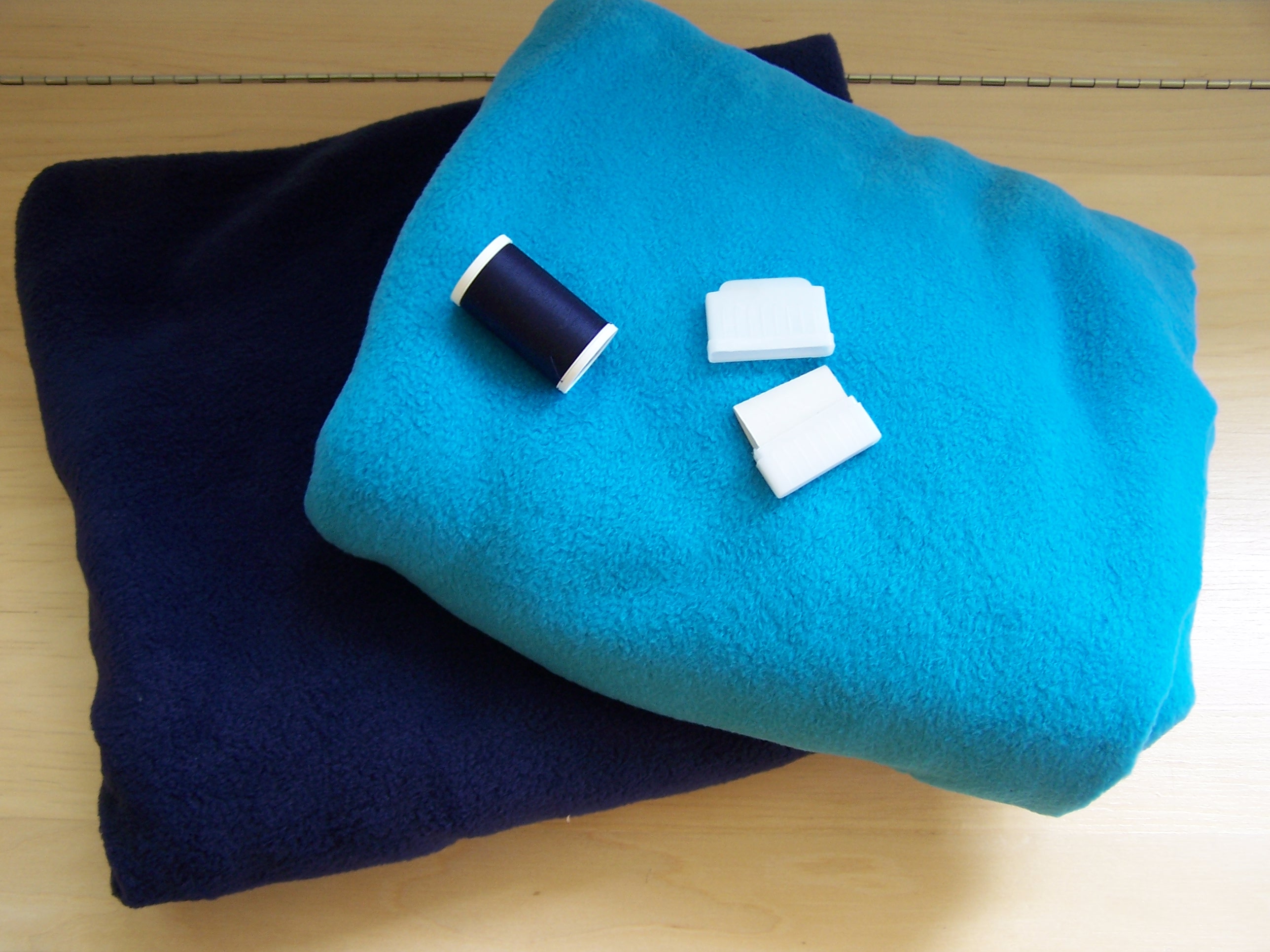 Gather your materials. You’ll need fleece of two different colors, tailor’s chalk and eventually some thread of a compatible color.