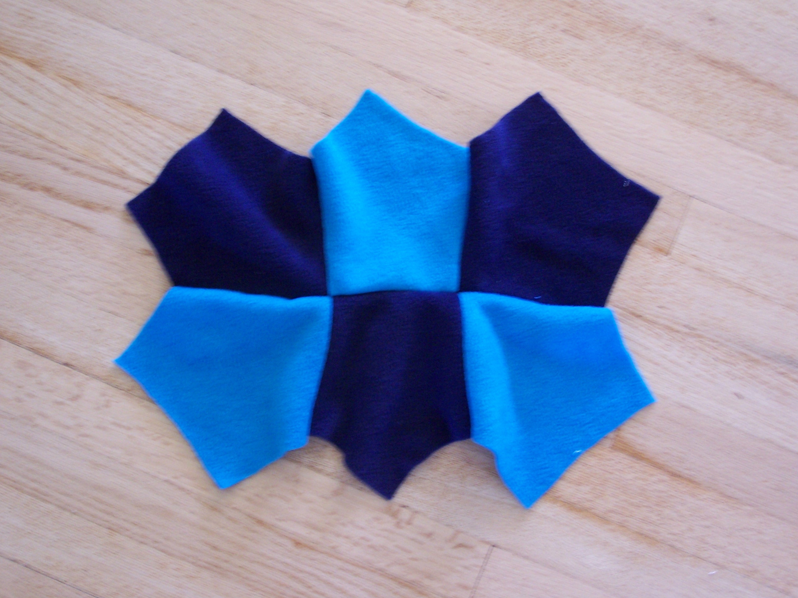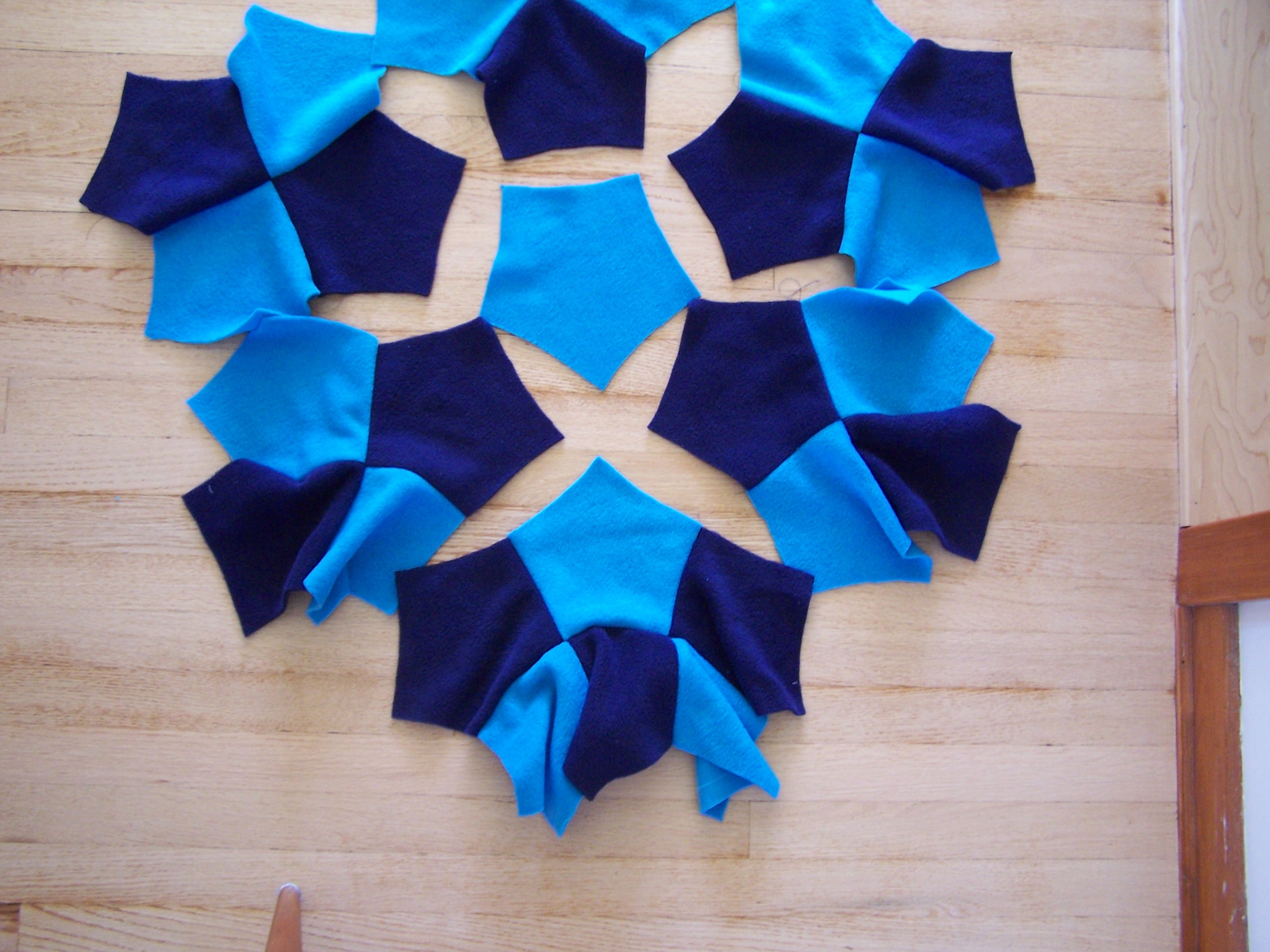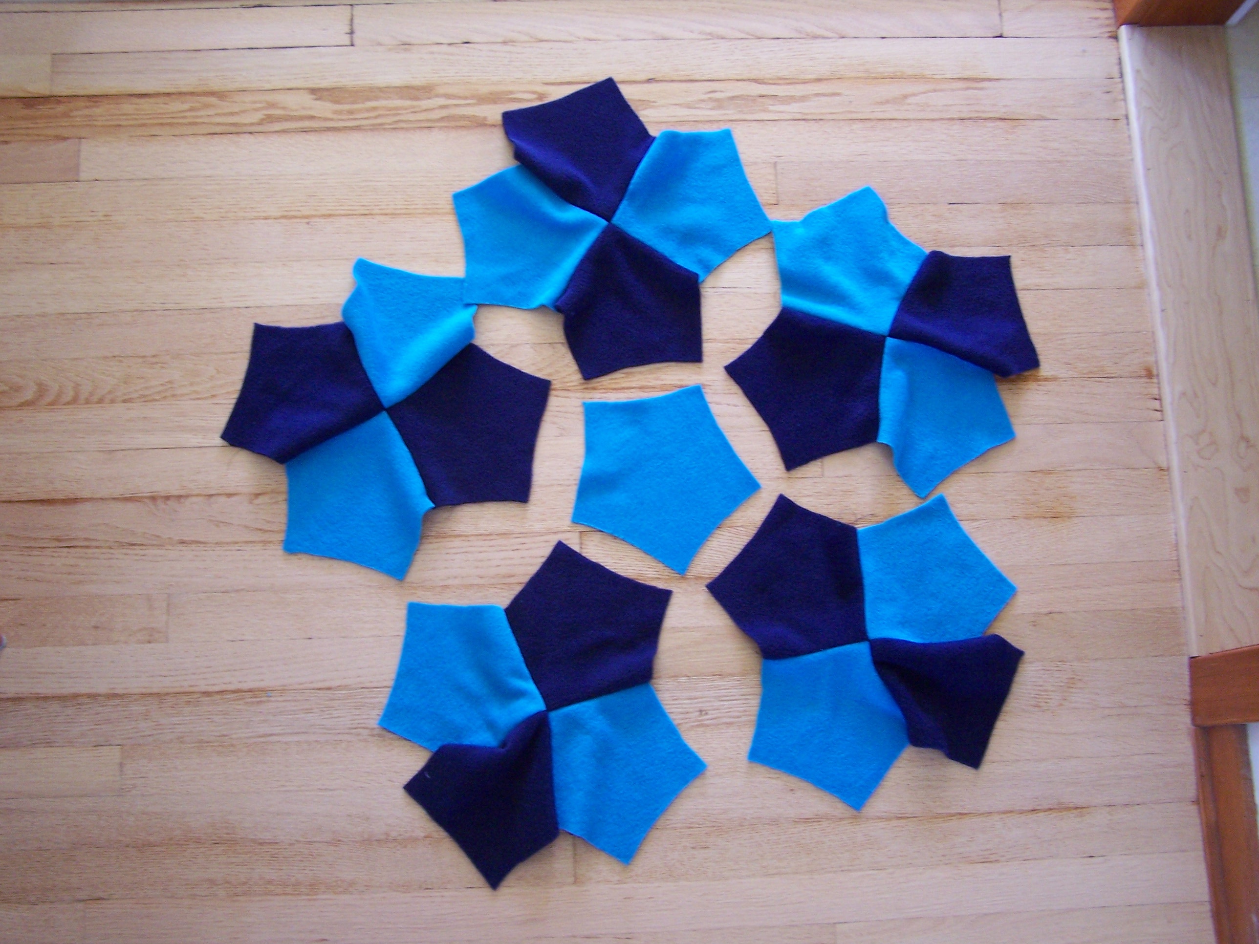 To make a blanket, you’ll cut lots of pentagons from a sheet of fleece and then sew them together.