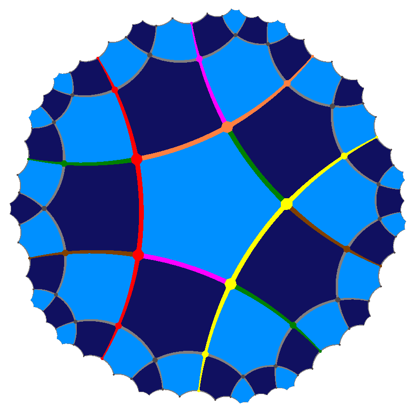 Ferguson’s hyperbolic blanket spreads out the curvature far more evenly than earlier designs did. Earlier designs typically called for cutting polygons from pieces of paper or cardboard and taping them together. For example, if you were to cut 51 pentagons from cardboard and tape them together with four pentagons meeting at each vertex, you’d get a surface superficially similar to Ferguson’s blanket, but with one major flaw: each cardboard pentagon has straight sides and 108° corner angles, so a total of 4 × 108° = 432° surround each vertex, which is more than the 360° that should surround a point. It’s as if someone took an iron and flattened each pentagon, pushing its curvature outward from its center and concentrating all the curvature at the vertices. The cardboard surface’s global shape remains correct — it’s a nice floppy hyperbolic plane — but its local shape is wrong. Locally the cardboard surface is flat (Euclidean) across all the pentagons, with “infinite curvature density” at the vertices.