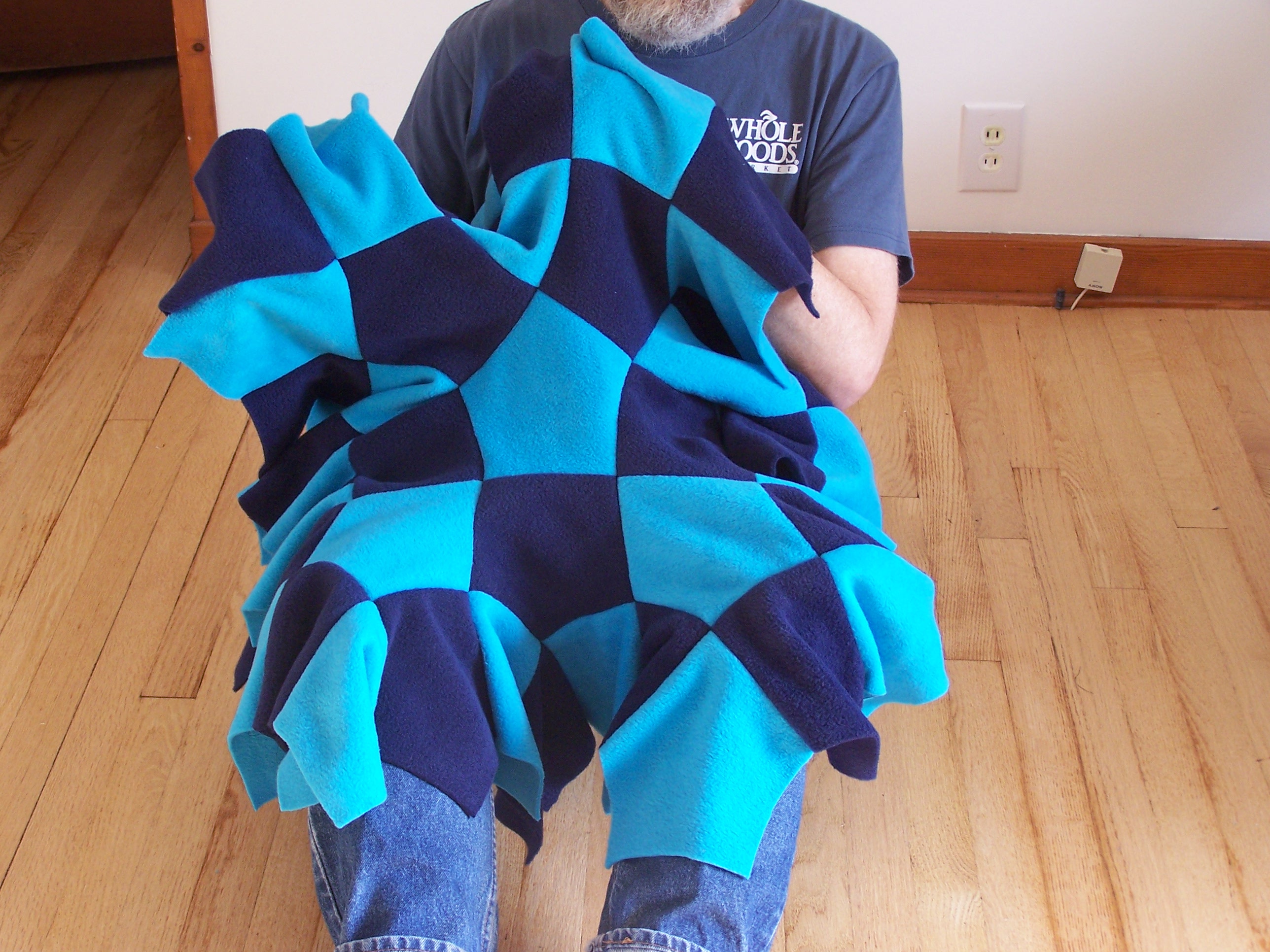 Ferguson kindly loaned me his poncho so that I could use it in a lecture and — better still — reverse-engineer it to make a hyperbolic blanket of my own. If you want to make one too, follow the instructions and photos below. Compared to older paper-and-scissors constructions of hyperbolic surfaces, Ferguson’s design