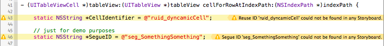 - Makes sure that all string literals in your code that reference reuse identifiers, Storyboard identifiers and Segue identifiers (according to a given or default naming convention) actually exist in your Storyboard(s).