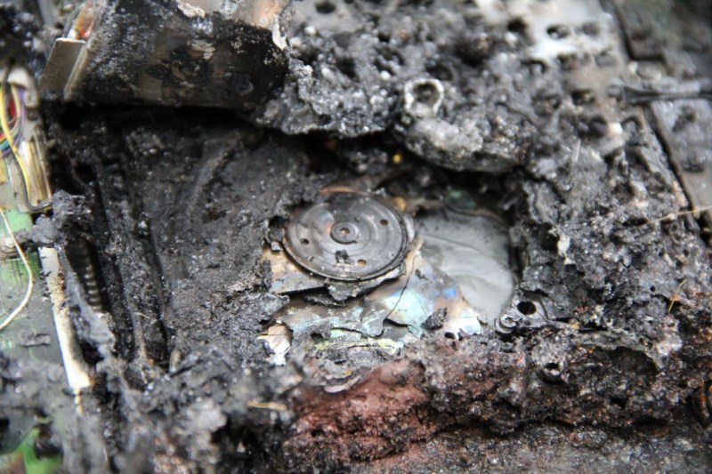 I decided to completely replace the cd rom with thermite. This gave me a ton of space to put things. I was pretty positive this would work. The hard drive is in the center of this laptop, which meant I had to place it on its side for this to be effective. You can see the thermite work its way down toward the drive in the video. As you can see in the pictures below, the drive cover is completely gone and the platters are destroyed. Success!