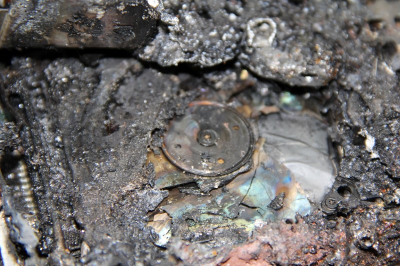 I wasn’t sure about this one. There isn’t a whole lot of space for thermite and the ignition system inside the box. On top of that, the only space was at the side of the hard drive, where the walls are the thickest. I had no idea if the small amount of thermite I used would penetrate the drive. It did, just barely as you can see in these pictures. It looks as if it pooled in the screw holes and made it inside. The platters are damaged.