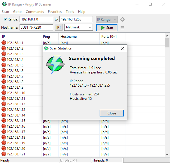 Same number of hosts alive, but a little slower. However, Angry IP Scanner is more robust in its pings and thread handling, so the few extra seconds is likely put to good use. I found my application to be somewhat inconsistent in finding all the alive hosts, which may be mitigated with multiple ping packets to send (instead of just one).