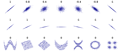 Clearly this song isn’t a Slow Build, our simple algorithm is fooled. To fix this we need to introduce a measure of how straight the ramp is. One way to measure the straightness of a line is to calculate the Pearson correlation for the loudness data as a function of time. XY Data with correlation that approaches one (or negative one) is by definition, linear. This nifty wikipedia visualization of the correlation of different datasets shows the correlation for various datasets: