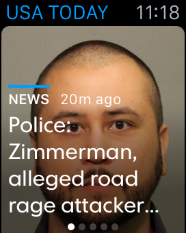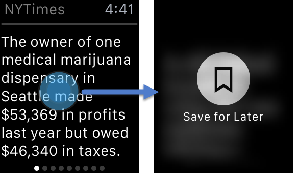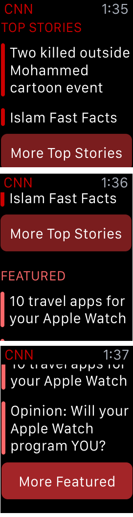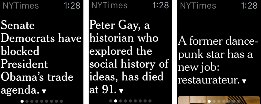 The deck of cards (a full-page relative of the carousel) is a presentation model that goes back at least 20 years. Cards provide sequential instead of direct access and usually should be reserved for content that has a clearly sequential nature (e.g., books) or for lists with just a few elements. Yet, on the watch, the deck of cards is preferable to the the alternative list interface, which often requires going back and forth between a list view and an item-detail view (a form of pogo sticking), and thus involves multistep navigation. Plus, with the deck of cards, users can easily trigger the contextual menu (to save the story for later reading on the phone, for example) for each item right away, whereas in the list view users must navigate to the detail to invoke the contextual menu corresponding to that item.