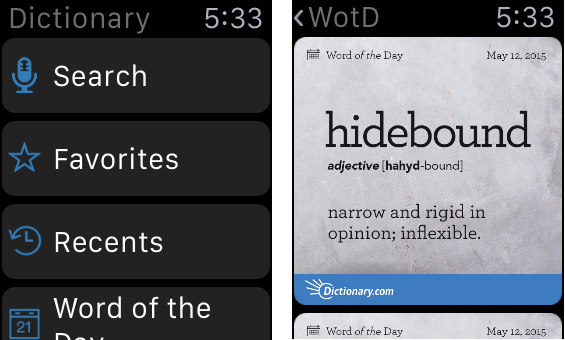 Beyond the novel hardware, emphasizing force touch and swipe-as-back as key gestures represents an interesting, albeit fairly timid opportunity for gesture standardization. The swipe-as-back is already part of the iOS gesture vocabulary, yet many users are not familiar with it because they don’t need to be (the Back button in Safari is accessible and more familiar — an example of the aforementioned interface redundancy). If Apple forced watch users to rely on the swipe for Back, then that gesture would perhaps trickle back to phones and tablets and become more standard. However, the swipe-as-back functionality is duplicated even on watches by a top Back/up button (see the hierarchical view in the Dictionary app above), which although difficult to use because of its small size, may still get more usage since it’s visible.