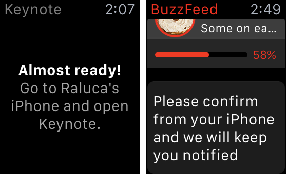 Handoff is a powerful tool that should be used not only for getting more detailed content that cannot fit the watch screen, but also, more generally, for tasks that cannot be done on the watch. In particular, designers should help users recover more smoothly from errors using handoff. Keynote, for instance, asks users to go to the iPhone and open the app, instead of using handoff to help them do that. Ideally, the apps should hand over situations like these to the phone app, instead of having people launch the app by themselves.