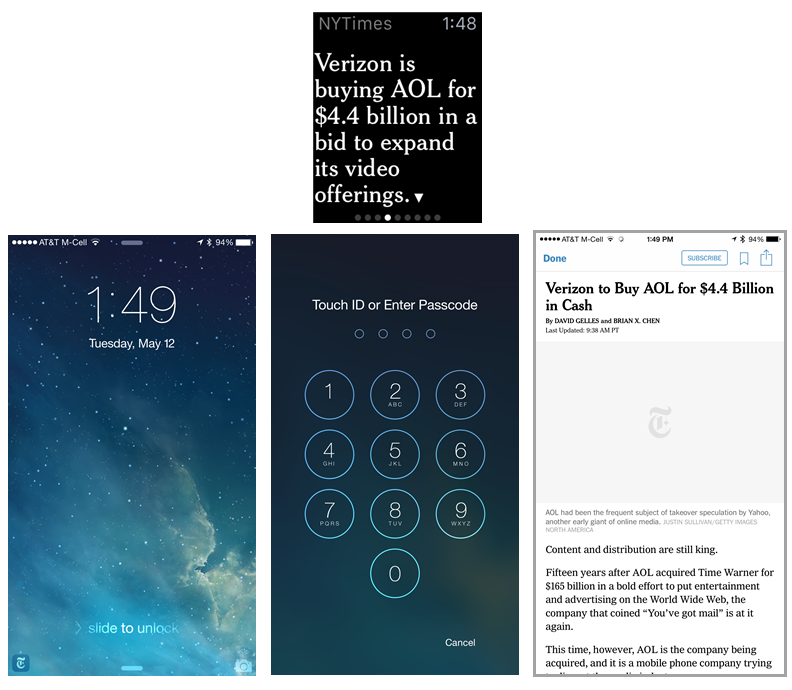 Handoff refers to allowing users to continue the task started on the watch on their phone. This used to be one of the strengths of the Samsung Galaxy Gear, but with the Apple Watch, the handoff is a lot more painful, for two reasons: (1) not all apps allow users to continue their tasks on the phone, and, more importantly, (2) the interaction cost of resuming the task is fairly high. Unlike with the Samsung Galaxy Gear, your iPhone is not automatically unlocked when the watch is in its immediate proximity. So you have to swipe up (not touch) a tiny icon in the bottom left corner of your lock screen — an utterly bizarre interaction design — and then unlock your phone before being able to continue the task on your phone.