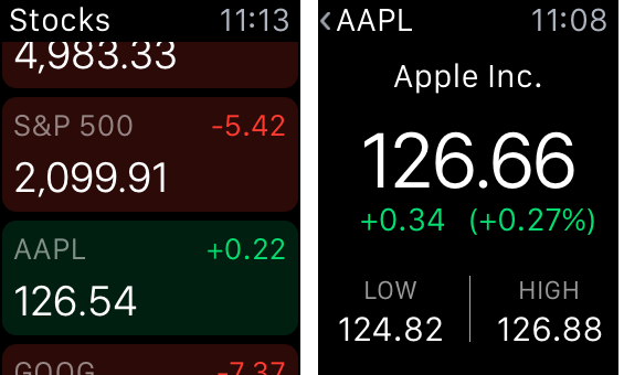 Allowing users to manipulate the level of detail in a stock chart (like Apple’s Stock app does) is unnecessary and does not belong on a watch. If I care about a stock enough as to have it in my list of stocks on my phone, I probably am mostly interested in checking last-minute changes on my watch, and not in researching its performance in the last 6 months.