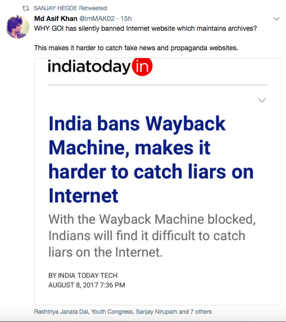 “With the Wayback Machine blocked, Indians will find it difficult to catch liars on the Internet. It may even hit India’s attempt to root out corruption, doublespeak and is likely to make a number of government bodies less accountable to citizens.” India Today claimed.