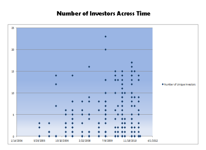 Investors have definitely taken note. In fact, so many have that the whole thing is turning into a feeding frenzy. The number of investors scrambling to participate in early stage rounds has ballooned. Each dot below is a specific company. On the x-axis is when they attended the accelerator, and on the y-axis is the total number of investors throughout the lifetime of the company. Despite being much younger companies, recent accelerator grads have on average more investors even though they will have had the opportunity to raise fewer rounds.
