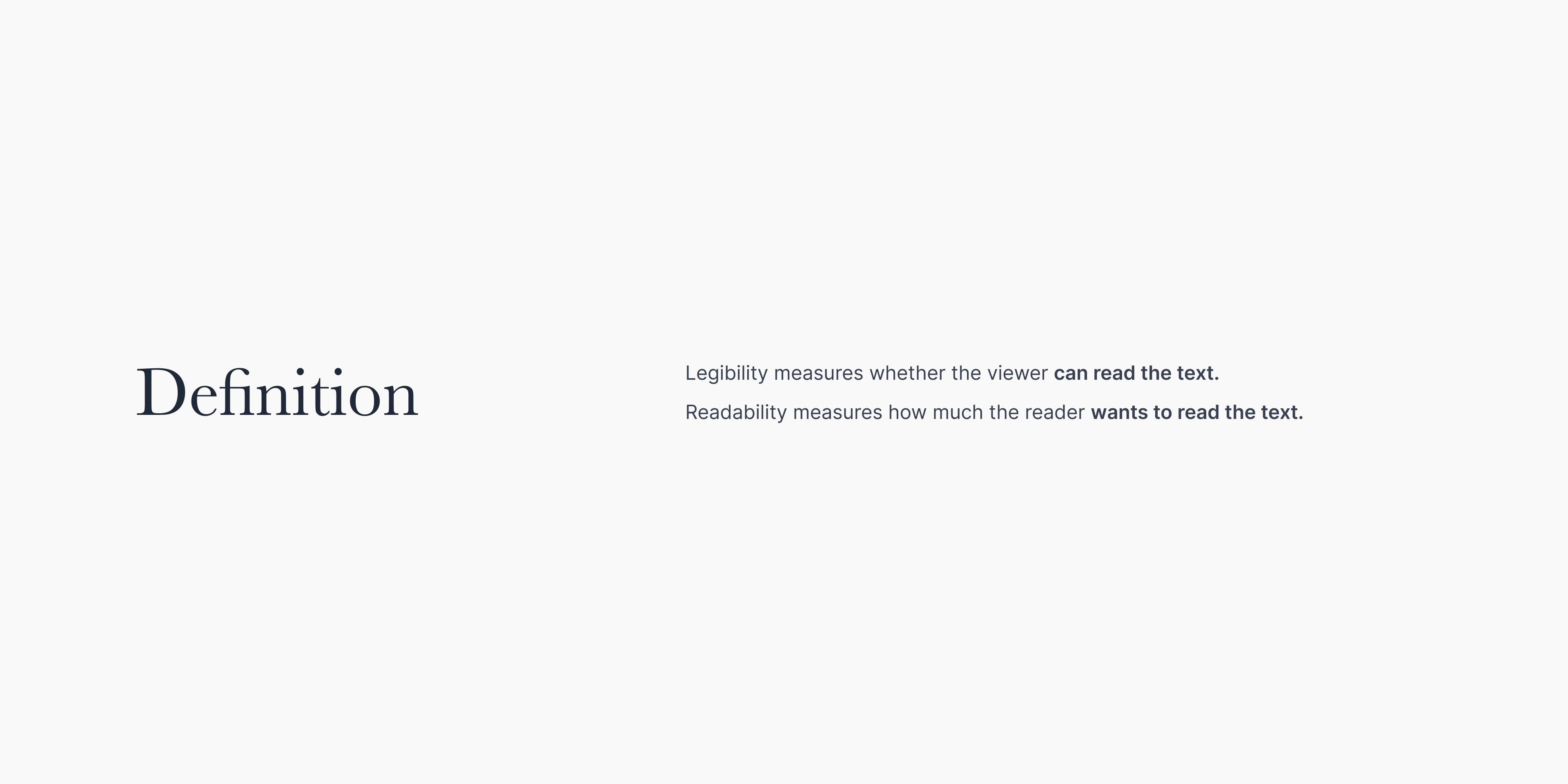 They sound similar but mean different things. Legibility is about how clearly letters can be distinguished, a function of font design, size, and contrast. Readability is about how easy it feels to read longer passages, affected by line length, spacing, and even the surrounding design.