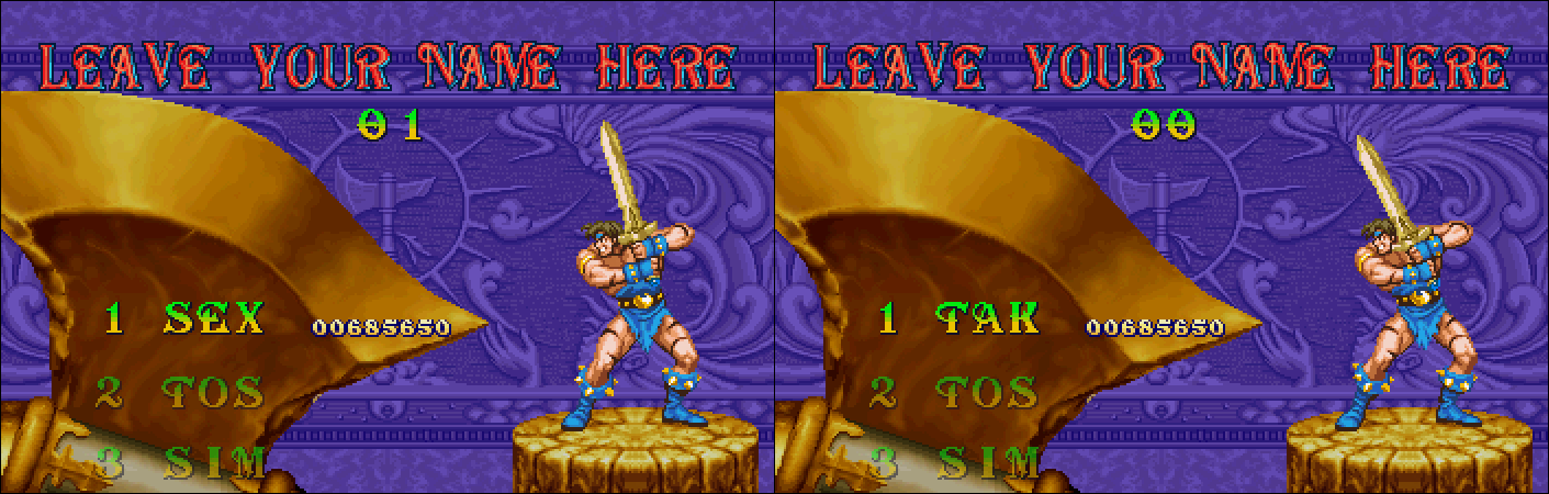 Other games also replace forbidden words with names of developers. For example, Golden Axe: The Duel will replace SEX with TAK in honor of game planner Motoshi Takabe. Or is it in honor of programmer Tomoaki Takayanagi?