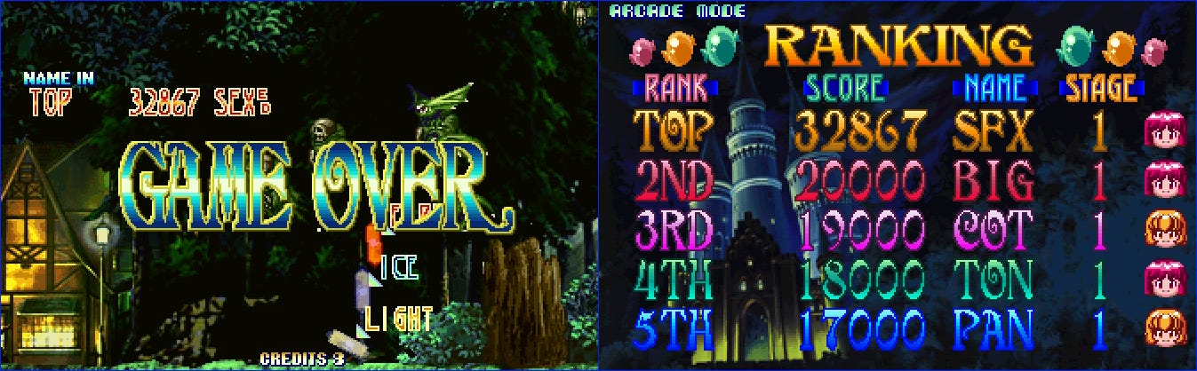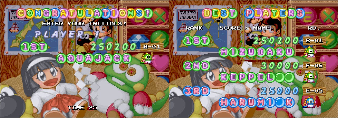 My favorite of all of the high score name replacements is Bubble Symphony, which won’t let you put in AAA, BBB, CCC, etc. It replaces them with a randomly-selected Taito game title: