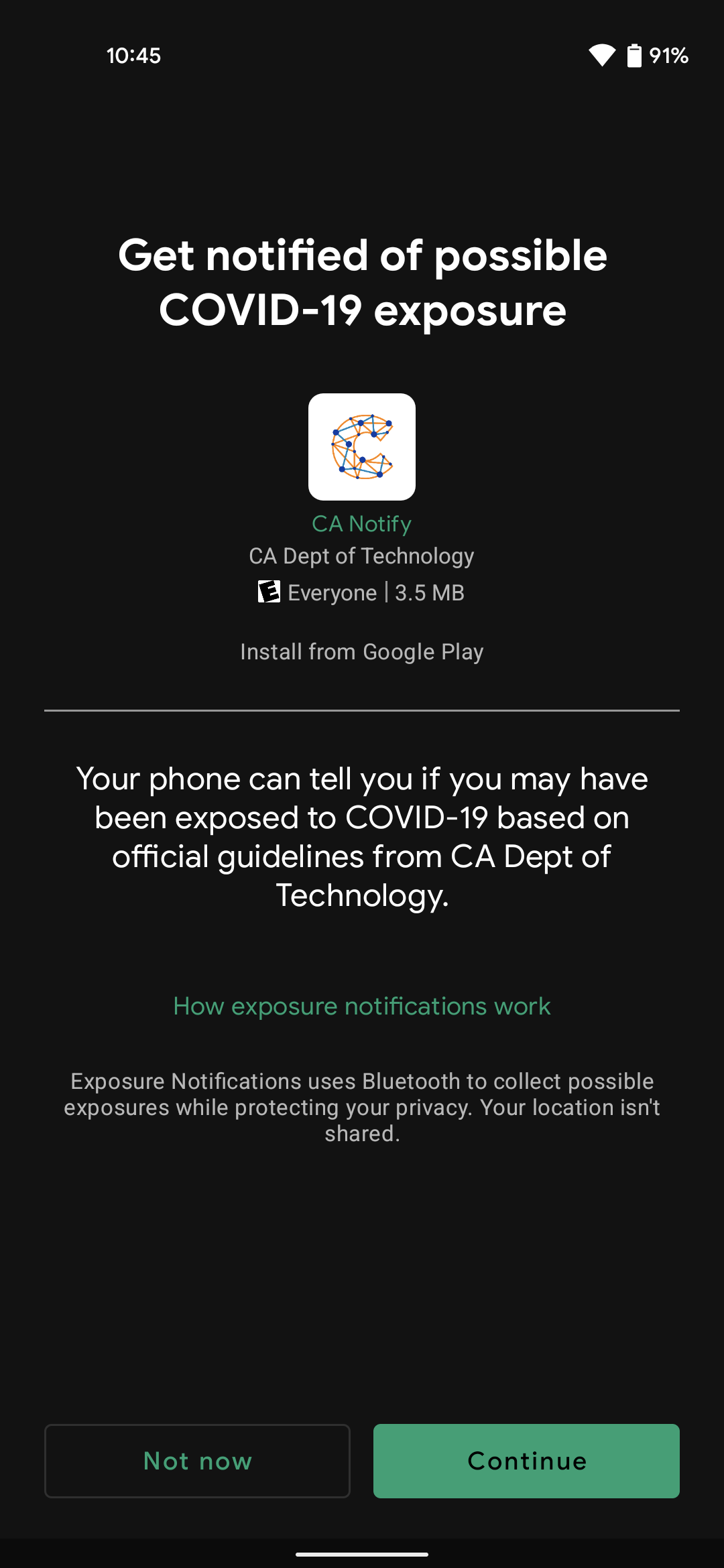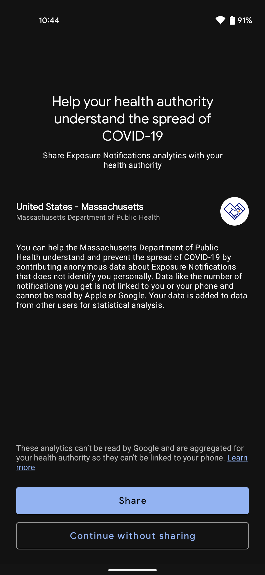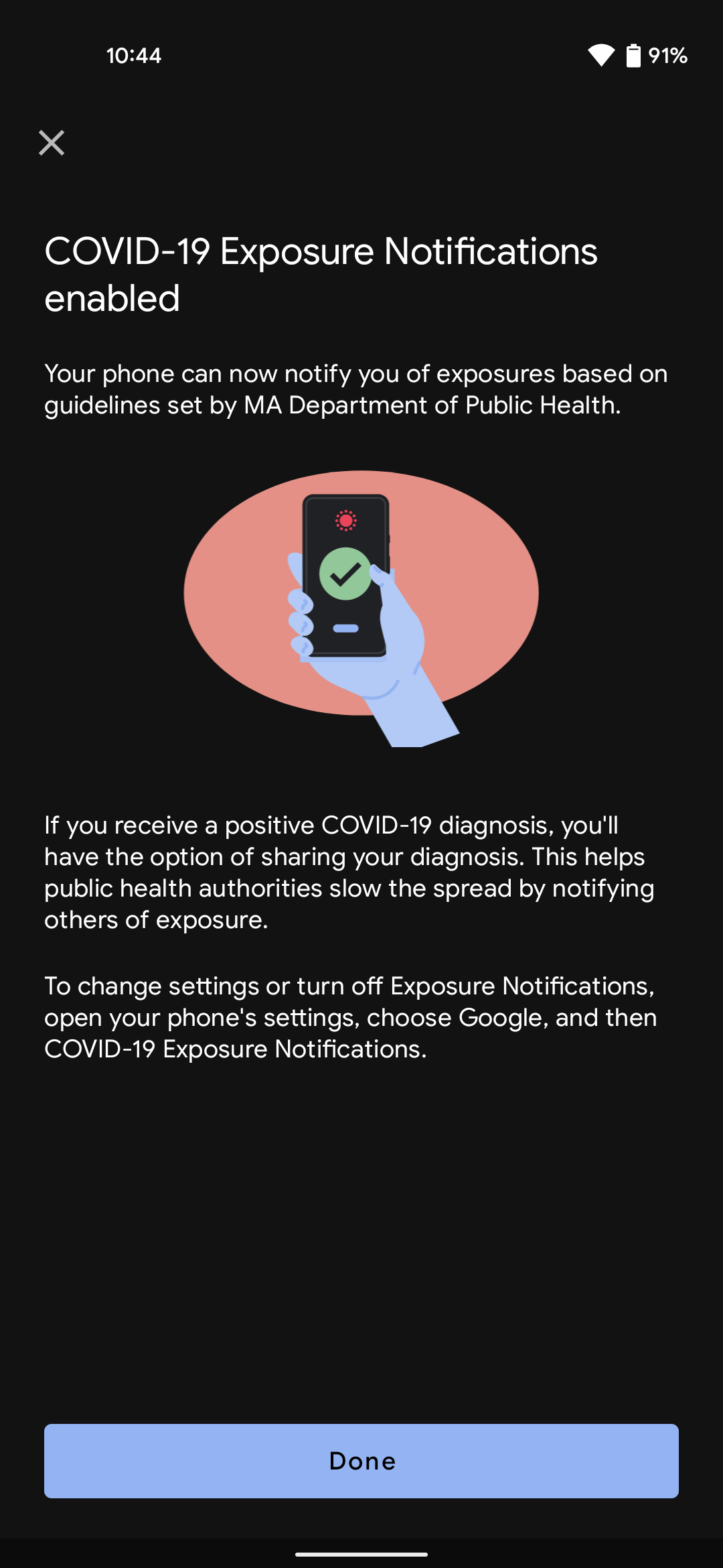 “We have been working with the Massachusetts Department of Public Health to allow users to activate the Exposure Notifications System directly from their Android phone settings. This functionality is built into the device settings and is automatically distributed by the Google Play Store, so users don’t have to download a separate app. COVID-19 Exposure Notifications are enabled only if a user proactively turns it on. Users decide whether to enable this functionality and whether to share information through the system to help warn others of possible exposure.“