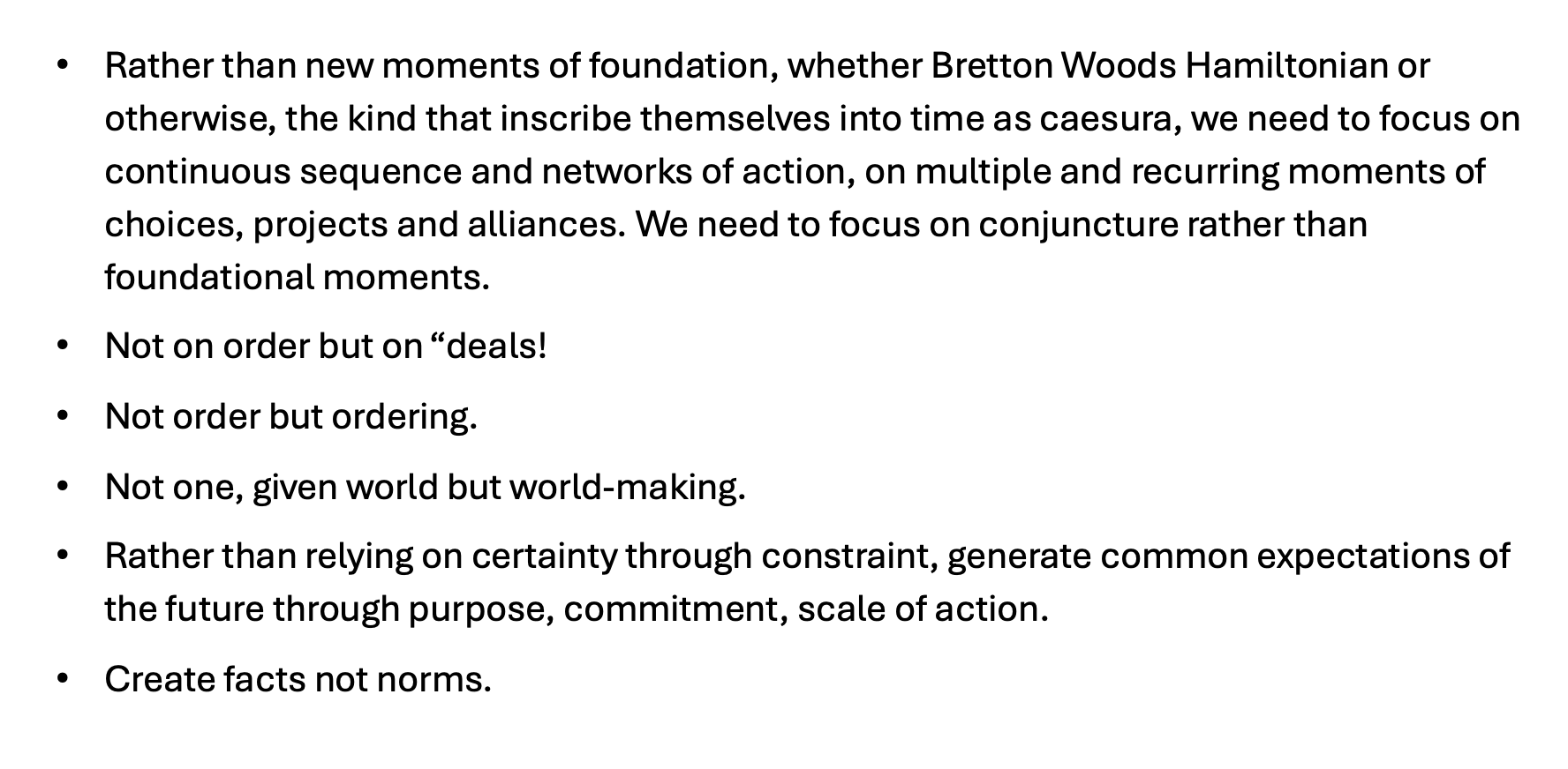 Rather than seeking new foundational moments, whether Bretton Woods, the Hamiltonian moment or other pivotal moments that inscribe themselves as full stops in history, we need to focus on continuous sequences, networks of action, recurring moments of choice. We need to focus on conjunctures rather than foundational moments. Rather than constitutions and orders. We might need to consider deals. Contaminated though the term has become under Trump’s presidency, a good deal in which two sides can see their interests might not be the worst outcome.