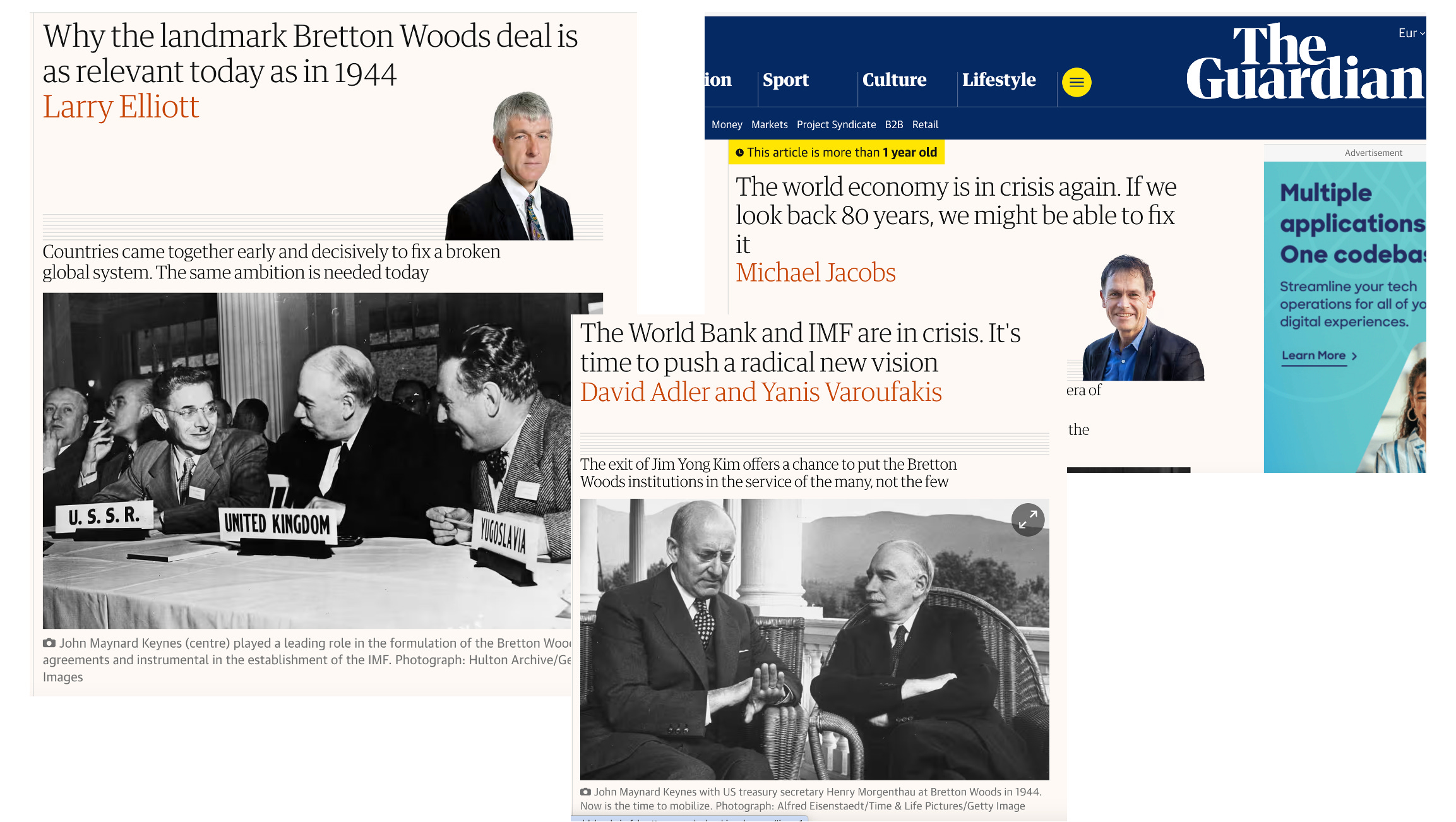 From a psychological perspective, the appeal of Bretton Woods suggests that it serves as a collective anchor. Why does discourse repeatedly return to this foundational moment, and what does it paper over? One indication is the misdating of the conference: it is often referred to as a post-war agreement, whereas in fact the agreement was made as the violence of the war headed towards its final crescendo in the summer of 1944, between the D-Day landing and the Soviet breakthrough against Army Group Centre in Operation Bagration.