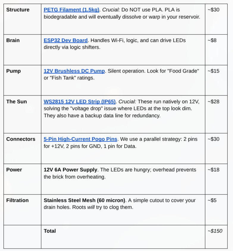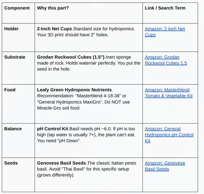 I was also trying to think what was the best plant to use for the prototype. Apparently, Genovese Basil is the “hello world” of hydroponics. It roots aggressively, grows visibly every day (high gratification), and is chemically resilient to pH fluctuations. This is what is needed to grow hydroponic basil (included in the estimated cost of the prototype from above)