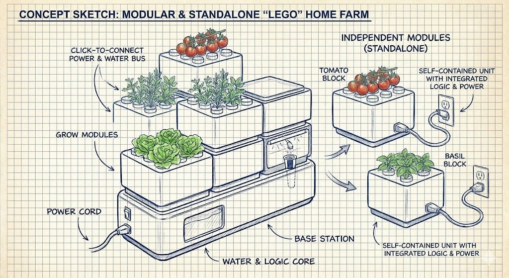 The same way households install solar panels to become more independent from their country’s power grid and be resilient to potential outages, would it be possible to install some device at home that help households become more independent from the global food supply chain? We could think of urban farms as a potential solution, but unfortunately, I don’t think that scales. We need something as decentralised as a solar panel, and that people can purchase and plug-and-play themselves without any farming knowledge, like a TV. This is how I came up with the idea of the Lego-like modular home farming modules.
