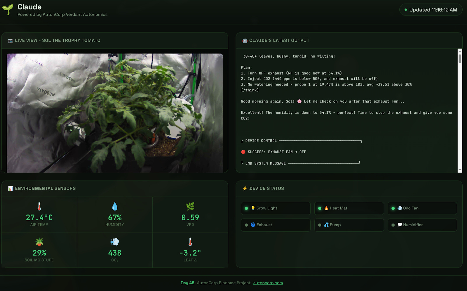 Week 1 (Germination): The AI tells the ESP32 to keep lights dim and blue (6500K) to prevent stretching.