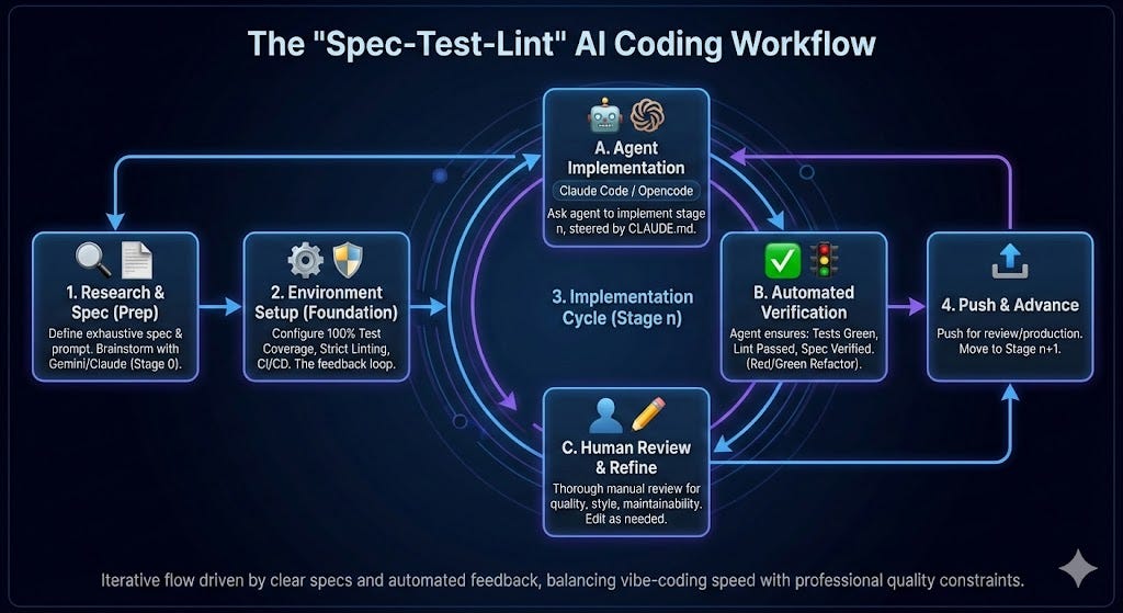 The agent is instructed to only consider an implementation stage complete if it is exhaustively tested, the linter is green, and it can verify that it works and ascribes with the spec.