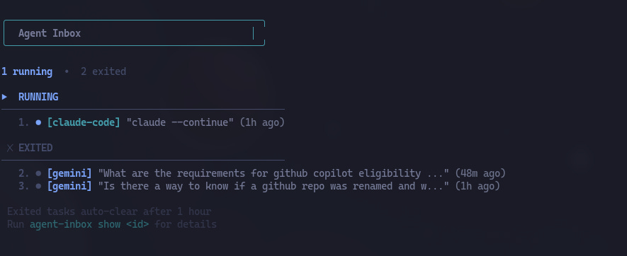 One of the vibe-coded projects from last week has been an agent inbox. This tool tracks the state of the different LLMs or agents that I am running. That way I don’t have to be continuously checking in on my agents. I usually have a primary task and leave others running in the background in the form of agents or deep research. Once I am finished with my main task, or I am at a point where I can afford some distraction, I go to my agent inbox and see if any of my agents need his human companion. So far this has been a huge improvement to the case where I was constantly checking if an agent was done or required my input.