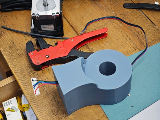 I trimmed the motor wiring to a length that would allow the connector to reach over the motor to its connector, with the end of the extension cable insulation sitting just inside the hole in the end of the boss. The length of this extension will be determined towards the end of the build as the overall wiring routing takes shape.